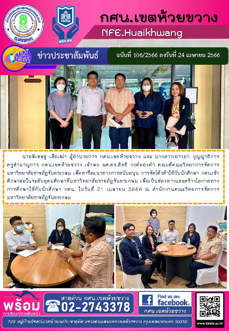 นายพิเชษฐ เสือเฒ่า ผู้อำนวยการ กศน.เขตห้วยขวาง และ นางสาวเยาวภา บุญญาธิการ ครูชำนาญการ กศน.เขตห้วยขวาง เข้าพบ ผศ.ดร.สิทธิ วงศ์ทองคำ คณบดีคณะวิทยาการจัดการ มหาวิทยาลัยราชภัฏจันทรเกษม เพื่อหารือแนวทางการสนับสนุน การจัดโค้วต้าให้กับนักศึกษา กศน.เข้าศึกษาต่อในระดับอุดมศึกษาที่มหาวิทยาลัยราขภัฏจันทรเกษม เพื่อเป็นช่องทางและสร้างโอกาสทางการศึกษาให้กับนักศึกษา กศน. ในวันที่ 21 เมษายน 2566 ณ สำนักงานคณะวิทยการจัดการ มหาวิทยาลัยราชภัฏจันทรเกษม