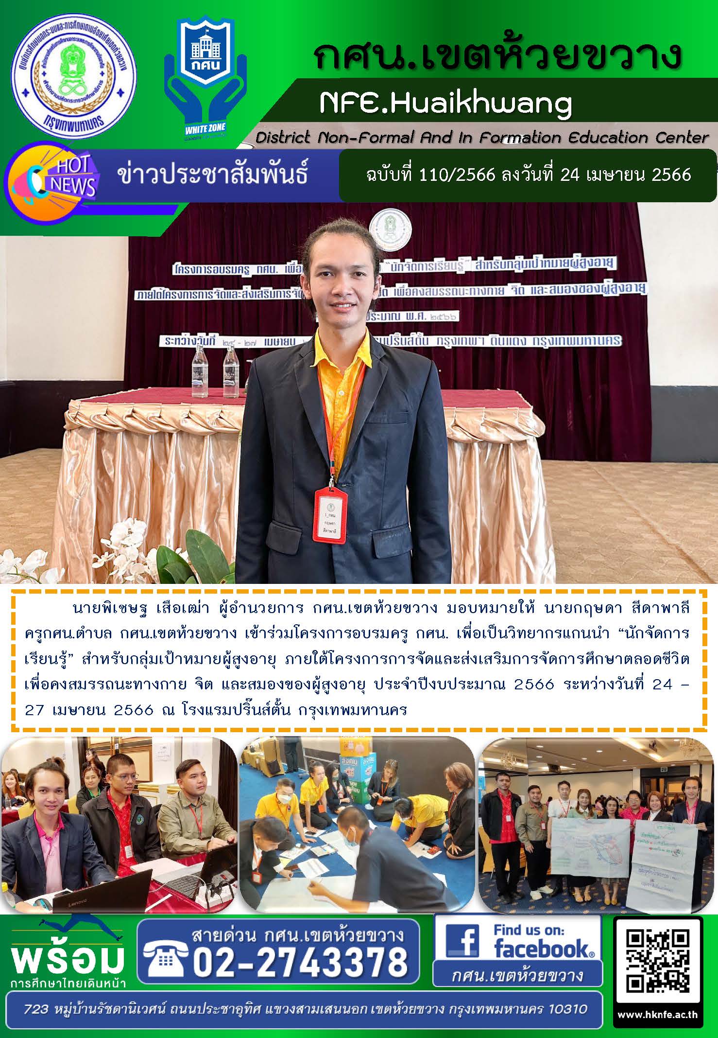 นายพิเชษฐ เสือเฒ่า ผู้อำนวยการ กศน.เขตห้วยขวาง มอบหมายให้ นายกฤษดา สีดาพาลี ครูกศน.ตำบล กศน.เขตห้วยขวาง เข้าร่วมโครงการอบรมครู กศน. เพื่อเป็นวิทยากรแกนนำ “นักจัดการเรียนรู้” สำหรับกลุ่มเป้าหมายผู้สูงอายุ ภายใต้โครงการการจัดและส่งเสริมการจัดการศึกษาตลอดชีวิต เพื่อคงสมรรถนะทางกาย จิต และสมองของผู้สูงอายุ ประจำปีงบประมาณ 2566 ระหว่างวันที่ 24 – 27 เมษายน 2566 ณ โรงแรมปริ๊นส์ตั้น กรุงเทพมหานคร