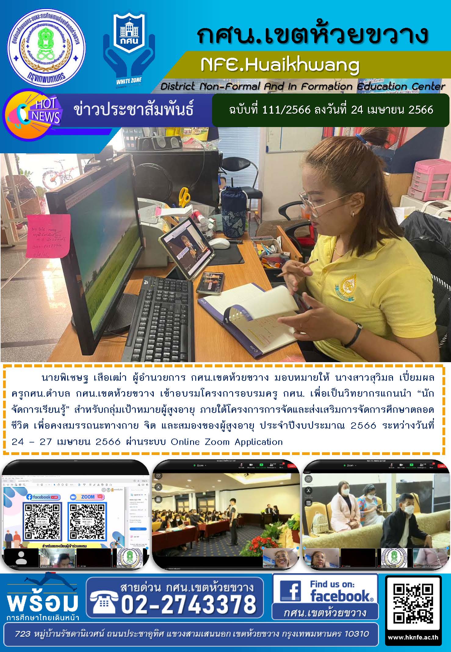 นายพิเชษฐ เสือเฒ่า ผู้อำนวยการ กศน.เขตห้วยขวาง มอบหมายให้ นางสาวสุวิมล เปี่ยมผล ครูกศน.ตำบล กศน.เขตห้วยขวาง เข้าอบรมโครงการอบรมครู กศน. เพื่อเป็นวิทยากรแกนนำ “นักจัดการเรียนรู้” สำหรับกลุ่มเป้าหมายผู้สูงอายุ ภายใต้โครงการการจัดและส่งเสริมการจัดการศึกษาตลอดชีวิต เพื่อคงสมรรถนะทางกาย จิต และสมองของผู้สูงอายุ ประจำปีงบประมาณ 2566 ระหว่างวันที่ 24 – 27 เมษายน 2566 ผ่านระบบ Online Zoom Application