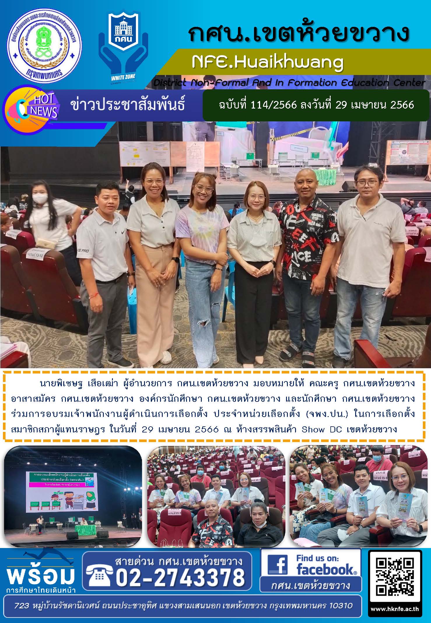 นายพิเชษฐ เสือเฒ่า ผู้อำนวยการ กศน.เขตห้วยขวาง มอบหมายให้ คณะครู กศน.เขตห้วยขวาง อาสาสมัคร กศน.เขตห้วยขวาง องค์กรนักศึกษา กศน.เขตห้วยขวาง และนักศึกษา กศน.เขตห้วยขวาง ร่วมการอบรมเจ้าพนักงานผู้ดำเนินการเลือกตั้ง ประจำหน่วยเลือกตั้ง (จพง.ปน.) ในการเลือกตั้งสมาชิกสภาผู้แทนราษฎร ในวันที่ 29 เมษายน 2566 ณ ห้างสรรพสินค้า Show DC เขตห้วยขวาง กรุงเทพฯ