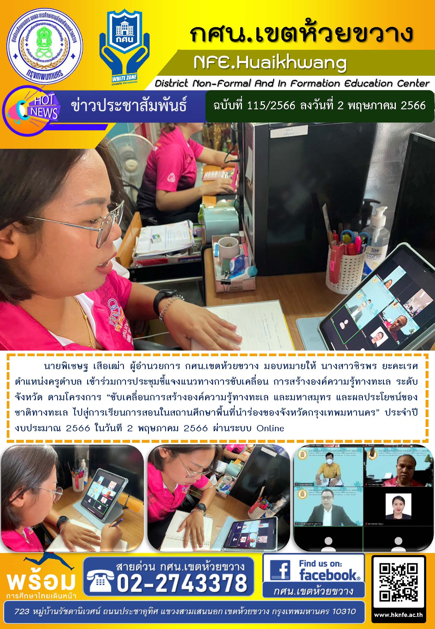 นายพิเชษฐ เสือเฒ่า ผู้อำนวยการ กศน.เขตห้วยขวาง มอบหมายให้ นางสาวชิรพร ยะคะเรศ ตำแหน่งครูตำบล เข้าร่วมการประชุมชี้แจงแนวทางการขับเคลื่อน การสร้างองค์ความรู้ทางทะเล ระดับจังหวัด ตามโครงการ “ขับเคลื่อนการสร้างองค์ความรู้ทางทะเล และมหาสมุทร และผลประโยชน์ของชาติทางทะเล ไปสู่การเรียนการสอนในสถานศึกษาพื้นที่นำร่องของจังหวัดกรุงเทพมหานคร” ประจำปีงบประมาณ 2566 ในวันที 2 พฤษภาคม 2566 ผ่านระบบ Online