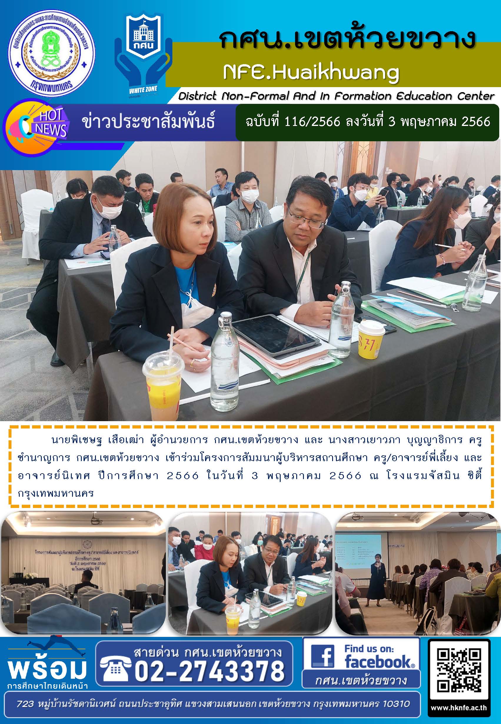 นายพิเชษฐ เสือเฒ่า ผู้อำนวยการ กศน.เขตห้วยขวาง และ นางสาวเยาวภา บุญญาธิการ ครูชำนาญการ กศน.เขตห้วยขวาง เข้าร่วมโครงการสัมมนาผู้บริหารสถานศึกษา ครู/อาจารย์พี่เลี้ยง และอาจารย์นิเทศ ปีการศึกษา 2566 ในวันที่ 3 พฤษภาคม 2566 ณ โรงแรมจัสมิน ซิตี้ กรุงเทพมหานคร