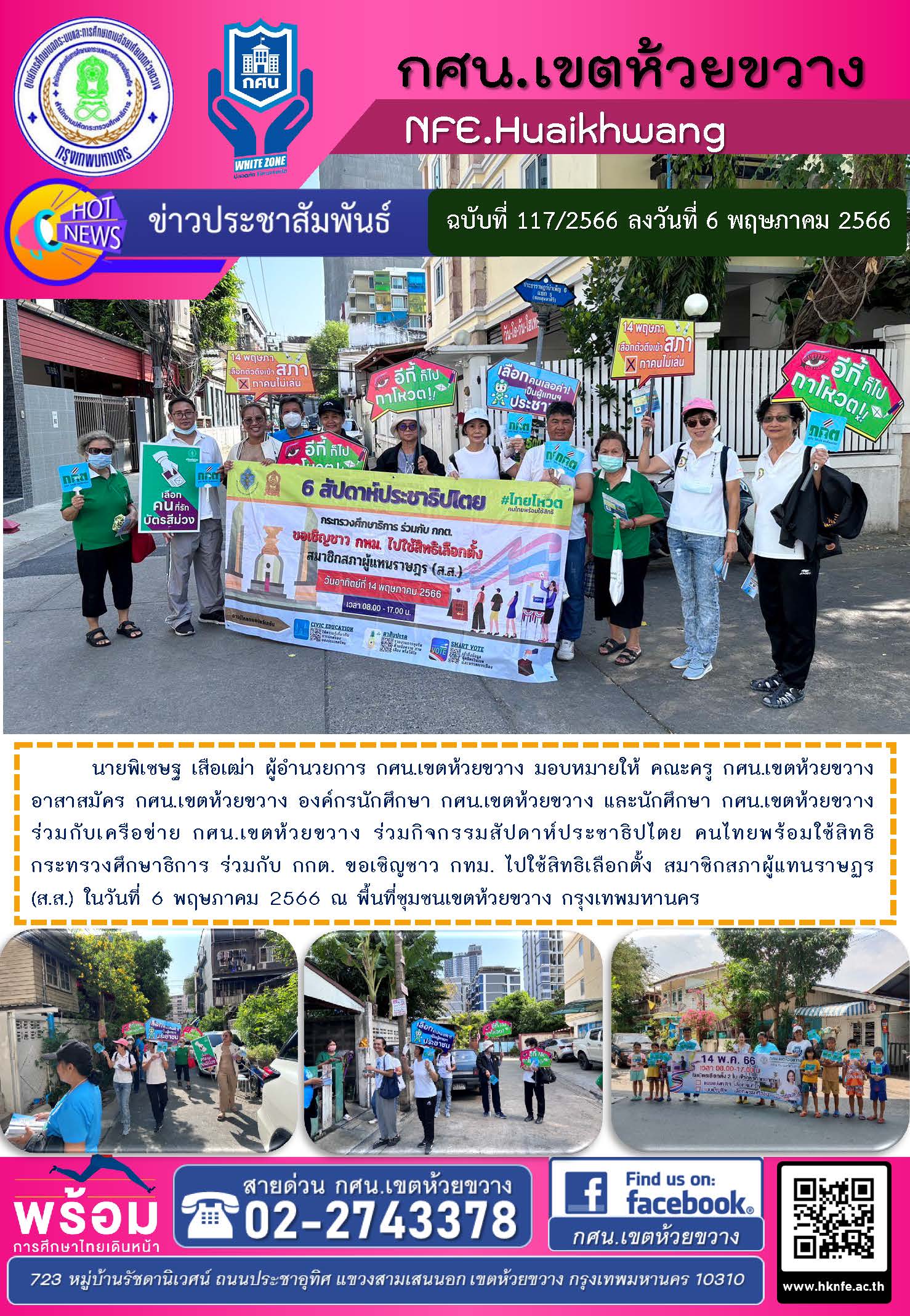 นายพิเชษฐ เสือเฒ่า ผู้อำนวยการ กศน.เขตห้วยขวาง มอบหมายให้ คณะครู กศน.เขตห้วยขวาง อาสาสมัคร กศน.เขตห้วยขวาง องค์กรนักศึกษา กศน.เขตห้วยขวาง และนักศึกษา กศน.เขตห้วยขวาง ร่วมกับเครือข่าย กศน.เขตห้วยขวาง ร่วมกิจกรรมสัปดาห์ประชาธิปไตย คนไทยพร้อมใช้สิทธิ กระทรวงศึกษาธิการ ร่วมกับ กกต. ขอเชิญชาว กทม. ไปใช้สิทธิเลือกตั้ง สมาชิกสภาผู้แทนราษฏร (ส.ส.) ในวันที่ 6 พฤษภาคม 2566 ณ พื้นที่ชุมชนเขตห้วยขวาง กรุงเทพมหานคร