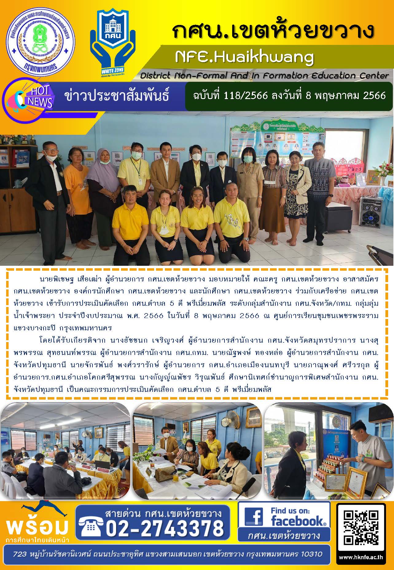 นายพิเชษฐ เสือเฒ่า ผู้อำนวยการ กศน.เขตห้วยขวาง มอบหมายให้ คณะครู กศน.เขตห้วยขวาง อาสาสมัคร กศน.เขตห้วยขวาง องค์กรนักศึกษา กศน.เขตห้วยขวาง และนักศึกษา กศน.เขตห้วยขวาง ร่วมกับเครือข่าย กศน.เขตห้วยขวาง เข้ารับการประเมินคัดเลือก กศน.ตำบล 5 ดี พรีเมี่ยมพลัส ระดับกลุ่มสำนักงาน กศน.จังหวัด/กทม. กลุ่มลุ่มน้ำเจ้าพระยา ประจำปีงบประมาณ พ.ศ. 2566 ในวันที่ 8 พฤษภาคม 2566 ณ ศูนย์การเรียนชุมชนเพชรพระราม แขวงบางกะปิ กรุงเทพมหานคร