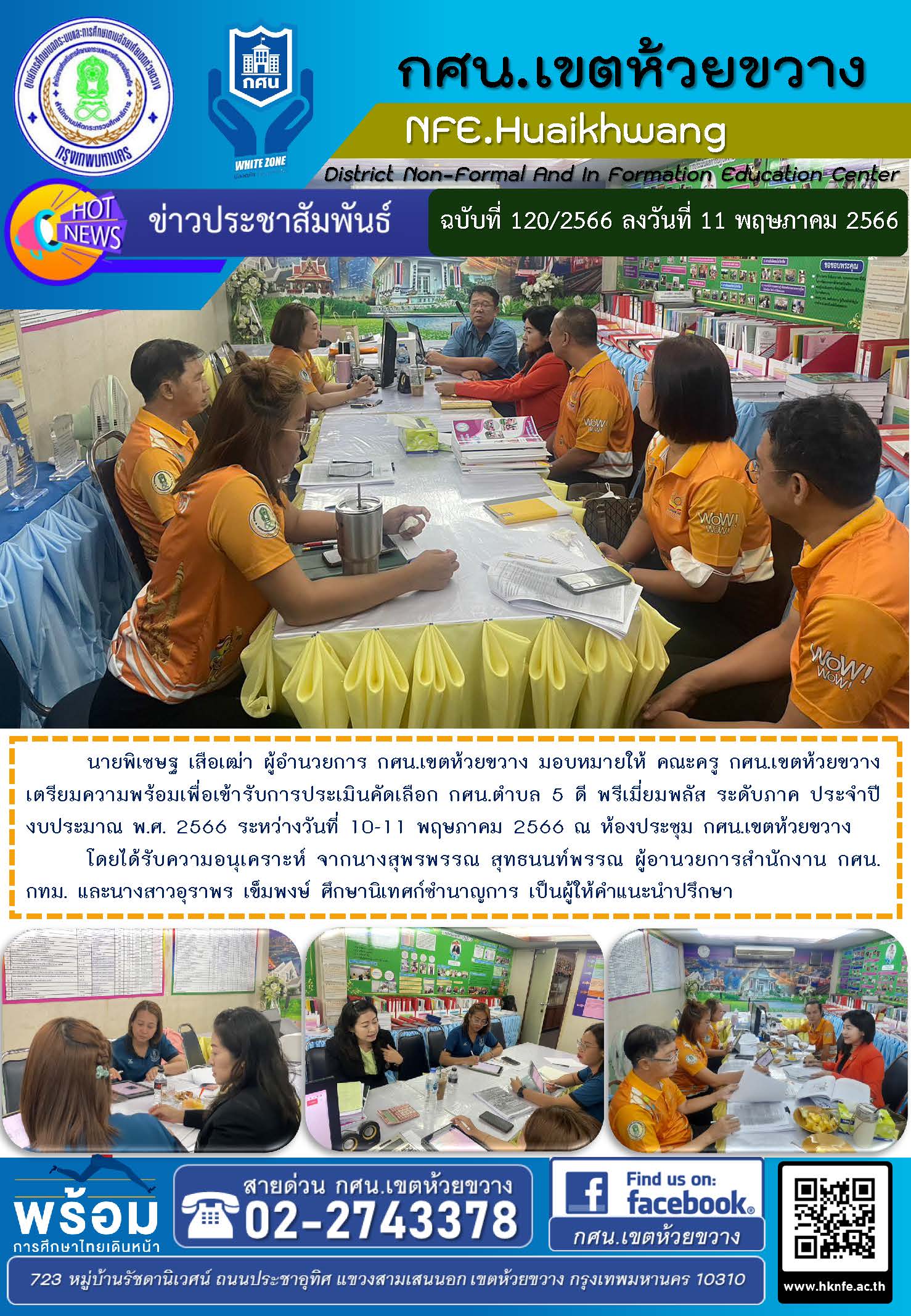 นายพิเชษฐ เสือเฒ่า ผู้อำนวยการ กศน.เขตห้วยขวาง มอบหมายให้ คณะครู กศน.เขตห้วยขวาง เตรียมความพร้อมเพื่อเข้ารับการประเมินคัดเลือก กศน.ตำบล 5 ดี พรีเมี่ยมพลัส ระดับภาค ประจำปีงบประมาณ พ.ศ. 2566 ระหว่างวันที่ 10-11 พฤษภาคม 2566 ณ ห้องประชุม กศน.เขตห้วยขวาง