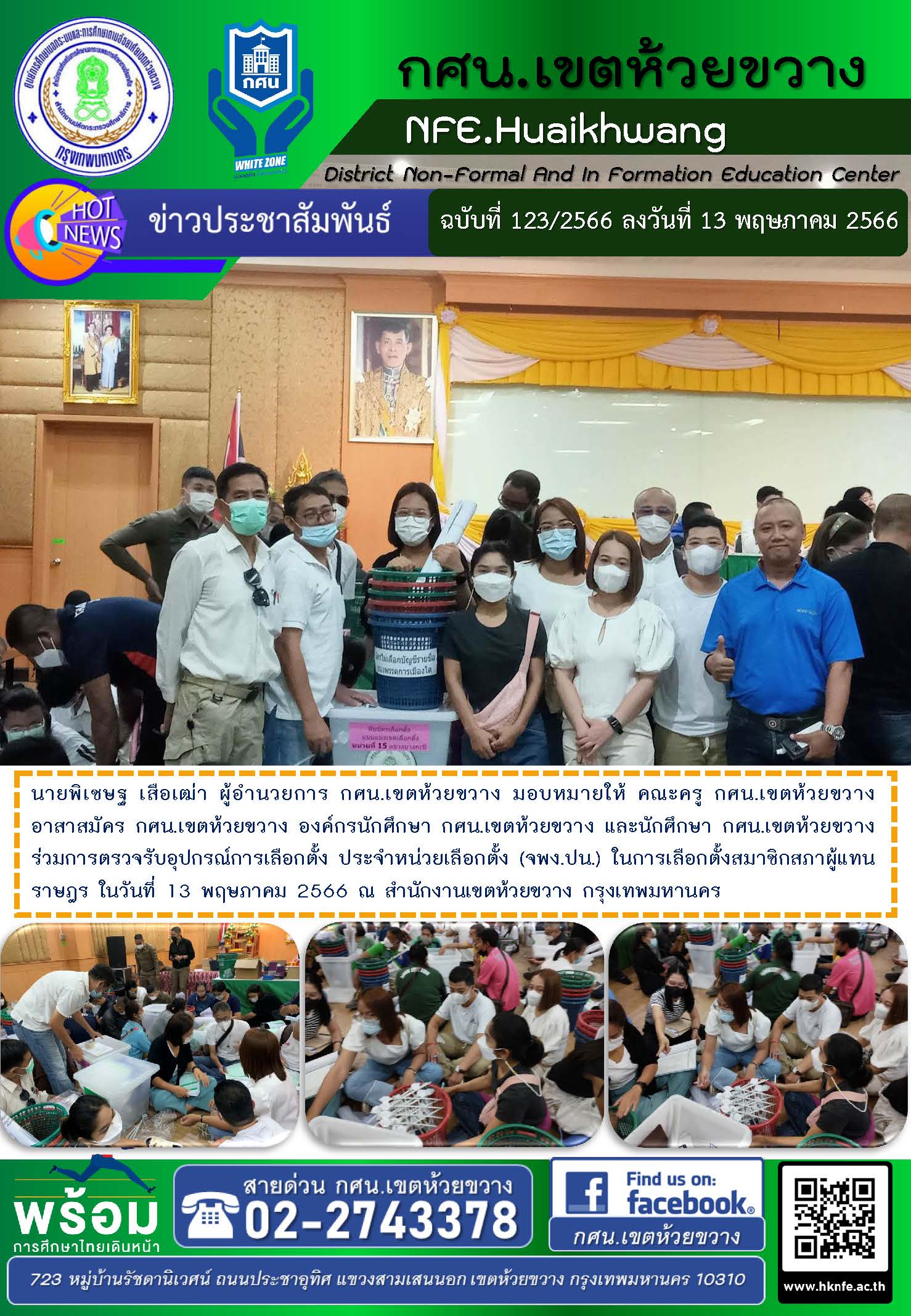 นายพิเชษฐ เสือเฒ่า ผู้อำนวยการ กศน.เขตห้วยขวาง มอบหมายให้ คณะครู กศน.เขตห้วยขวาง อาสาสมัคร กศน.เขตห้วยขวาง องค์กรนักศึกษา กศน.เขตห้วยขวาง และนักศึกษา กศน.เขตห้วยขวาง ร่วมการตรวจรับอุปกรณ์การเลือกตั้ง ประจำหน่วยเลือกตั้ง (จพง.ปน.) ในการเลือกตั้งสมาชิกสภาผู้แทนราษฎร ในวันที่ 13 พฤษภาคม 2566 ณ สำนักงานเขตห้วยขวาง กรุงเทพมหานคร