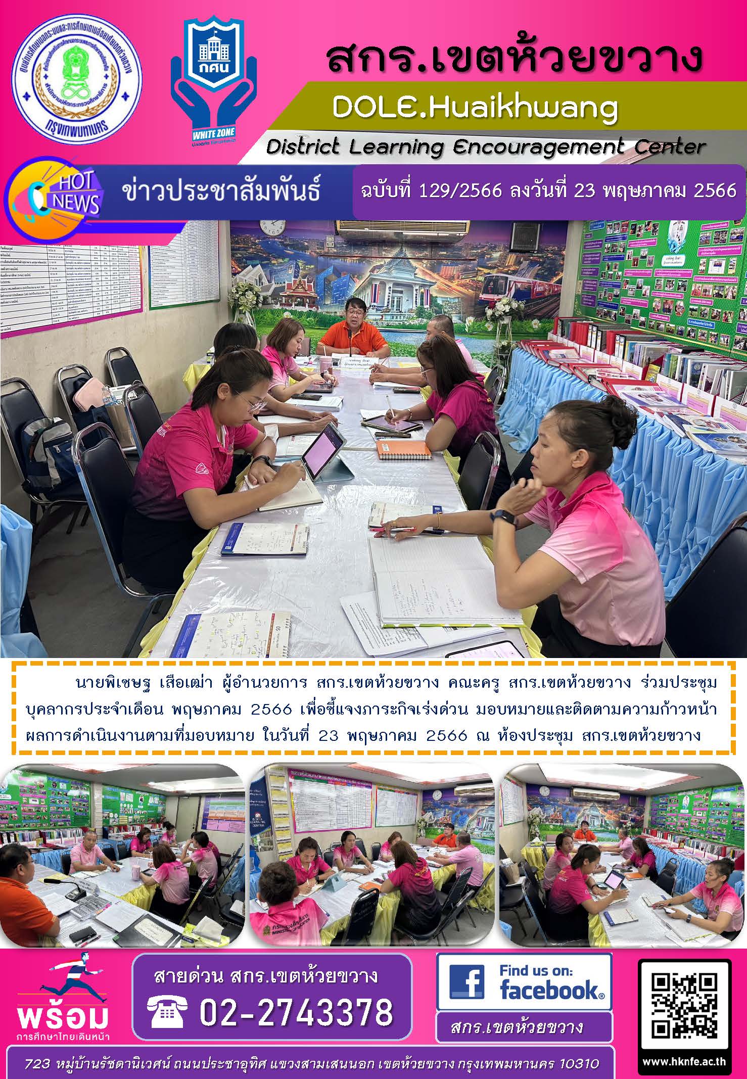 นายพิเชษฐ เสือเฒ่า ผู้อำนวยการ สกร.เขตห้วยขวาง คณะครู สกร.เขตห้วยขวาง ร่วมประชุมบุคลากรประจำเดือน พฤษภาคม 2566 เพื่อชี้แจงภาระกิจเร่งด่วน มอบหมายและติดตามความก้าวหน้าผลการดำเนินงานตามที่มอบหมาย ในวันที่ 23 พฤษภาคม 2566 ณ ห้องประชุม สกร.เขตห้วยขวาง