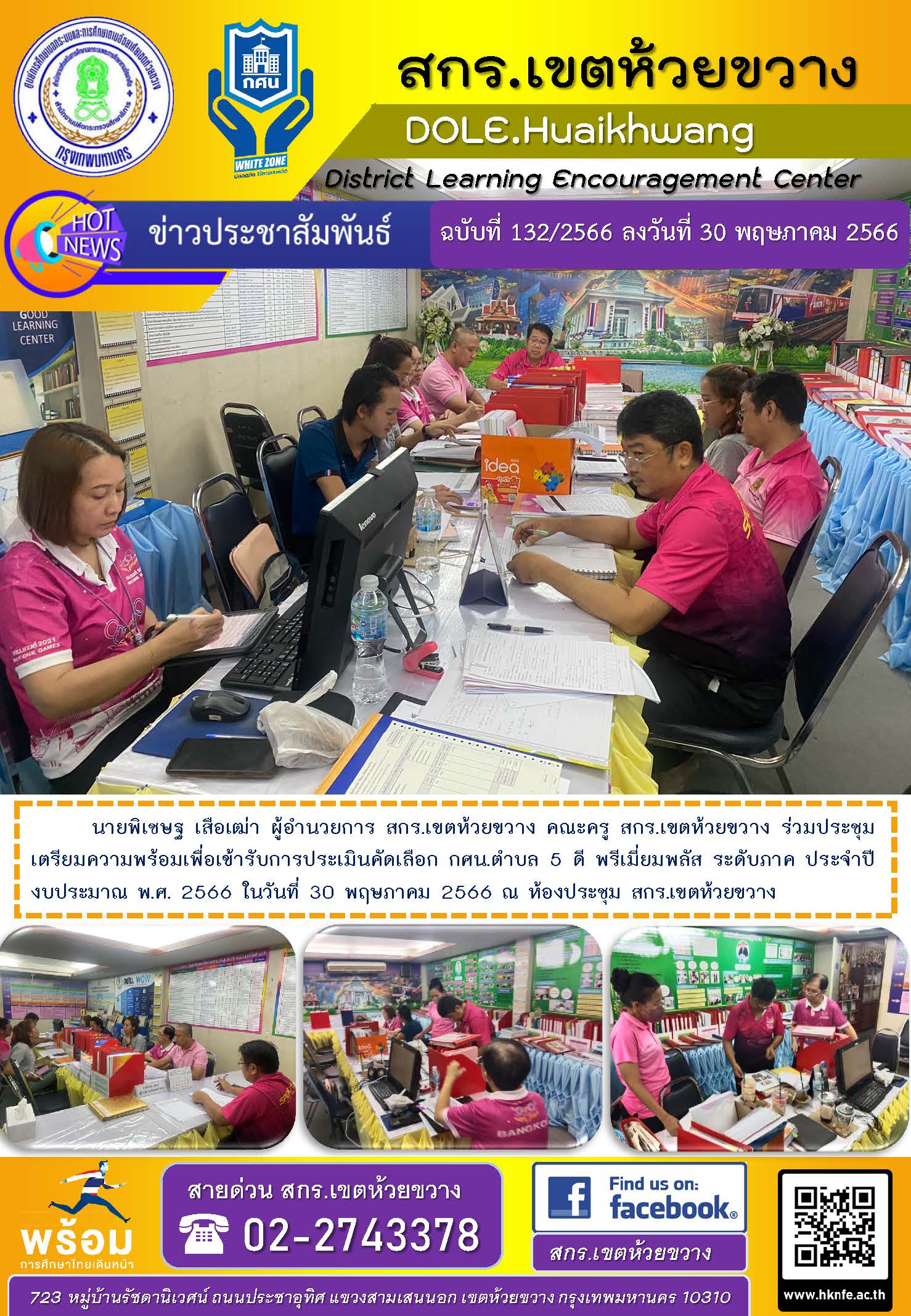 นายพิเชษฐ เสือเฒ่า ผู้อำนวยการ สกร.เขตห้วยขวาง คณะครู สกร.เขตห้วยขวาง ร่วมประชุมเตรียมความพร้อมเพื่อเข้ารับการประเมินคัดเลือก กศน.ตำบล 5 ดี พรีเมี่ยมพลัส ระดับภาค ประจำปีงบประมาณ พ.ศ. 2566 ในวันที่ 30 พฤษภาคม 2566 ณ ห้องประชุม สกร.เขตห้วยขวาง