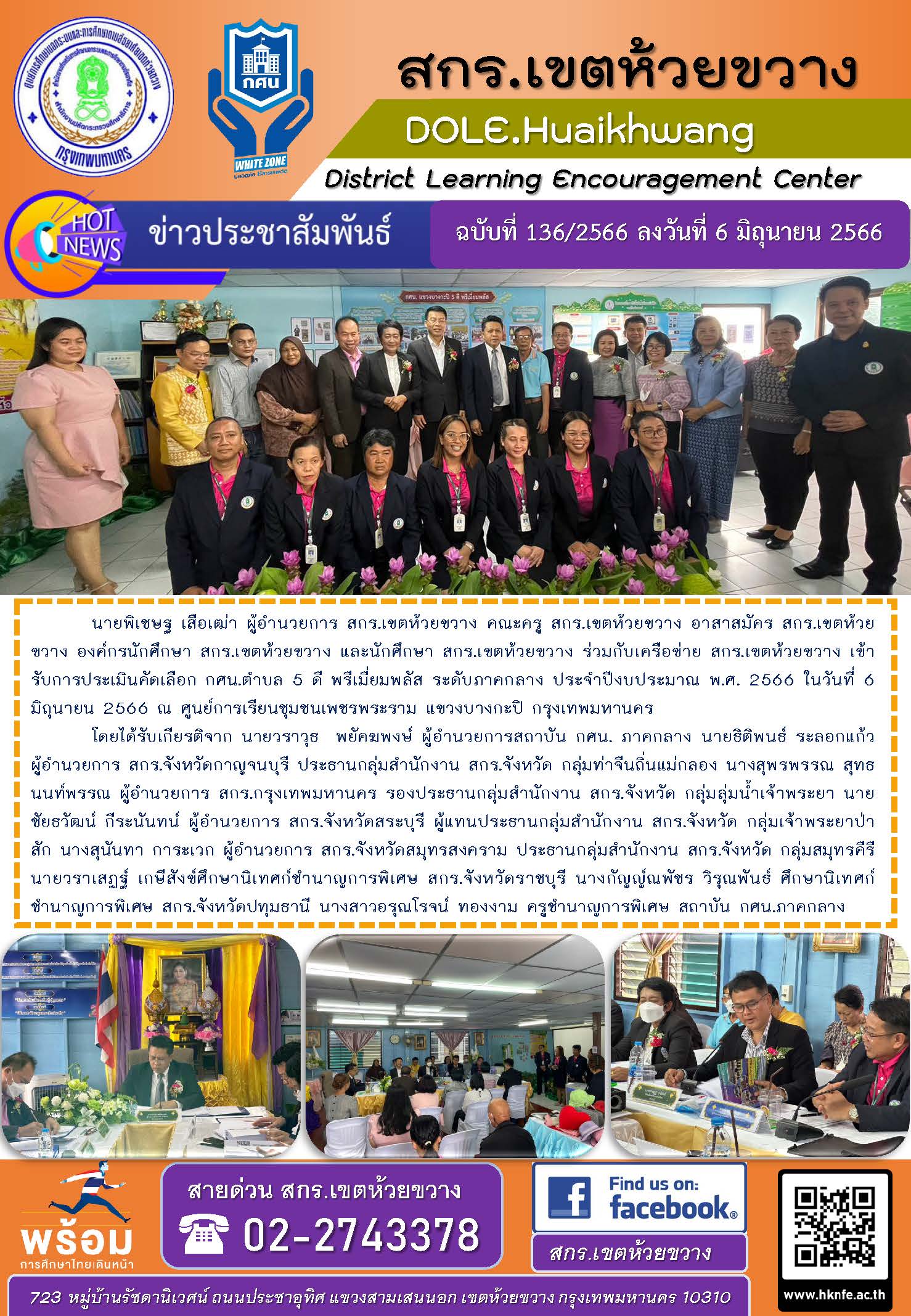 นายพิเชษฐ เสือเฒ่า ผู้อำนวยการ สกร.เขตห้วยขวาง คณะครู สกร.เขตห้วยขวาง อาสาสมัคร สกร.เขตห้วยขวาง องค์กรนักศึกษา สกร.เขตห้วยขวาง และนักศึกษา สกร.เขตห้วยขวาง ร่วมกับเครือข่าย สกร.เขตห้วยขวาง เข้ารับการประเมินคัดเลือก กศน.ตำบล 5 ดี พรีเมี่ยมพลัส ระดับภาคกลาง ประจำปีงบประมาณ พ.ศ. 2566 ในวันที่ 6 มิถุนายน 2566 ณ ศูนย์การเรียนชุมชนเพชรพระราม แขวงบางกะปิ กรุงเทพมหานคร