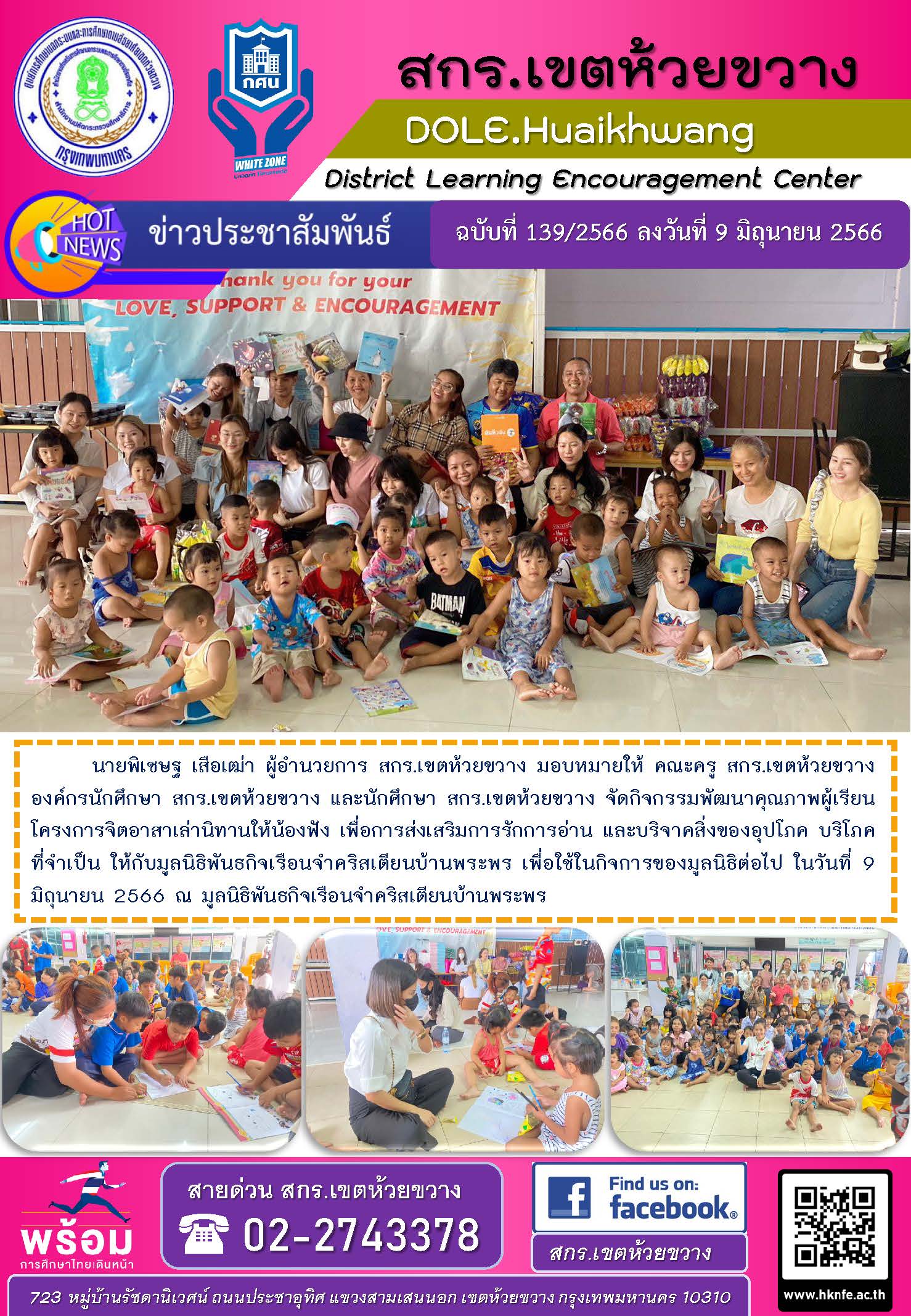 นายพิเชษฐ เสือเฒ่า ผู้อำนวยการ สกร.เขตห้วยขวาง มอบหมายให้ คณะครู สกร.เขตห้วยขวาง องค์กรนักศึกษา สกร.เขตห้วยขวาง และนักศึกษา สกร.เขตห้วยขวาง จัดกิจกรรมพัฒนาคุณภาพผู้เรียน โครงการจิตอาสาเล่านิทานให้น้องฟัง เพื่อการส่งเสริมการรักการอ่าน และบริจาคสิ่งของอุปโภค บริโภค ที่จำเป็น ให้กับมูลนิธิพันธกิจเรือนจำคริสเตียนบ้านพระพร เพื่อใช้ในกิจการของมูลนิธิต่อไป ในวันที่ 9 มิถุนายน 2566 ณ มูลนิธิพันธกิจเรือนจำคริสเตียนบ้านพระพร