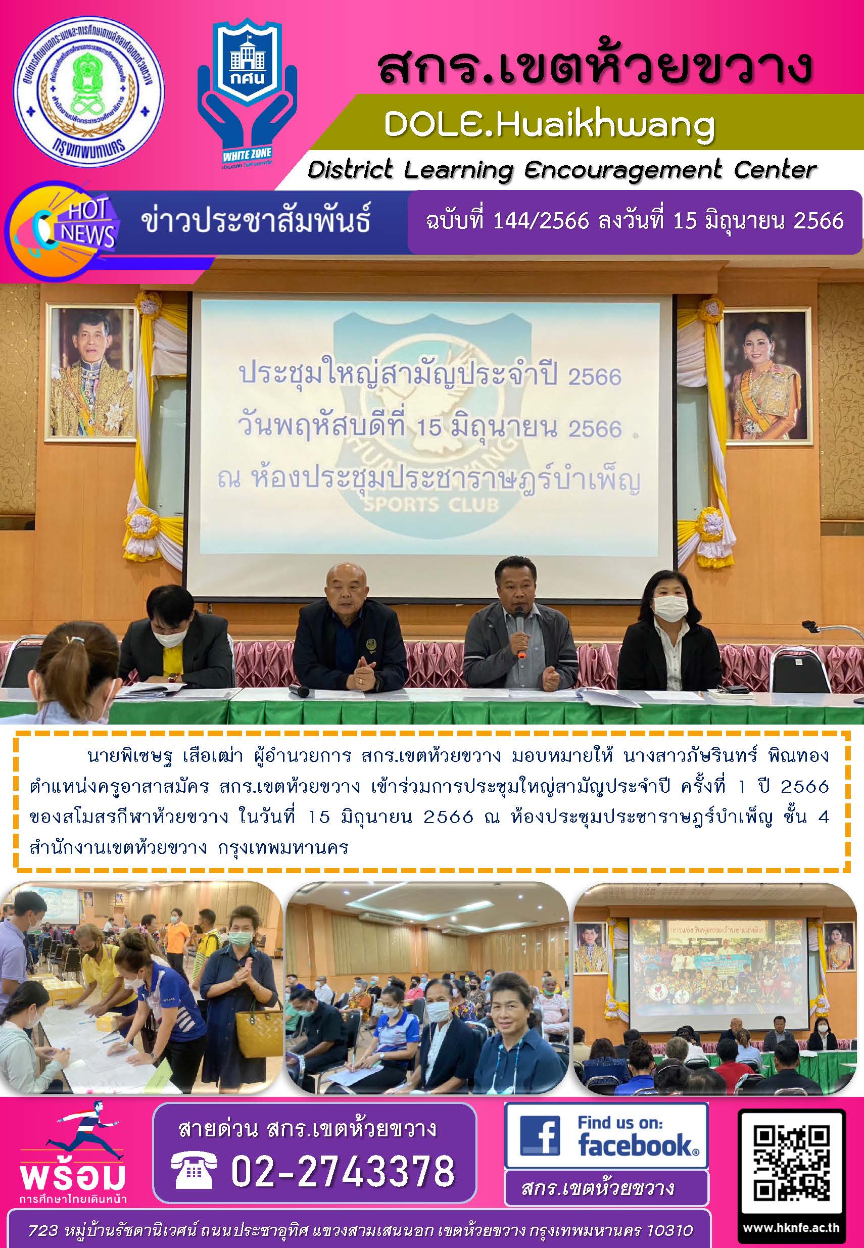 นายพิเชษฐ เสือเฒ่า ผู้อำนวยการ สกร.เขตห้วยขวาง มอบหมายให้ นางสาวภัษรินทร์ พิณทอง ตำแหน่งครูอาสาสมัคร สกร.เขตห้วยขวาง เข้าร่วมการประชุมใหญ่สามัญประจำปี ครั้งที่ 1 ปี 2566 ของสโมสรกีฬาห้วยขวาง ในวันที่ 15 มิถุนายน 2566 ณ ห้องประชุมประชาราษฎร์บำเพ็ญ ชั้น 4 สำนักงานเขตห้วยขวาง กรุงเทพมหานคร