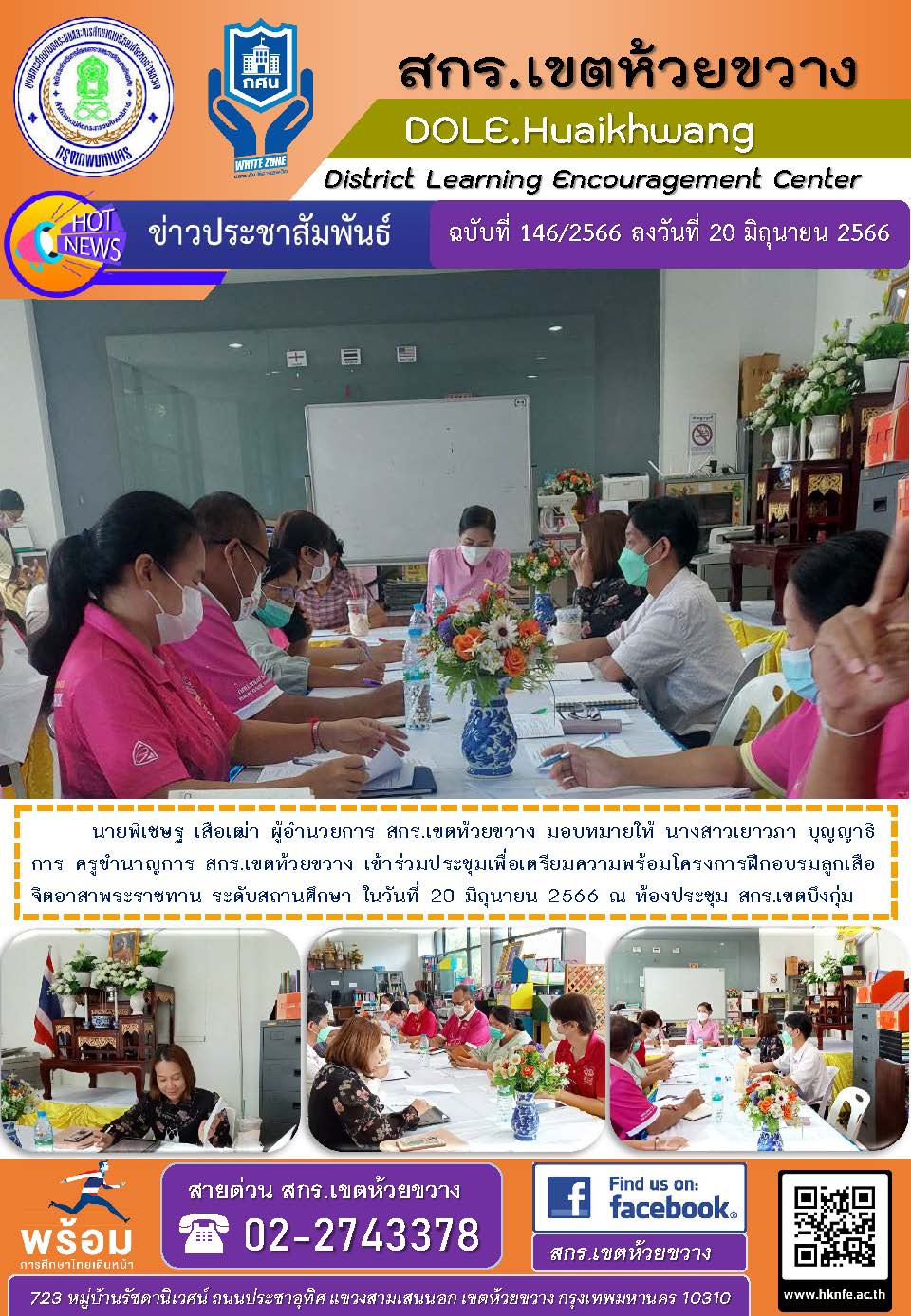 นายพิเชษฐ เสือเฒ่า ผู้อำนวยการ สกร.เขตห้วยขวาง มอบหมายให้ นางสาวเยาวภา บุญญาธิการ ครูชำนาญการ สกร.เขตห้วยขวาง เข้าร่วมประชุมเพื่อเตรียมความพร้อมโครงการฝึกอบรมลูกเสือจิตอาสาพระราชทาน ระดับสถานศึกษา ในวันที่ 20 มิถุนายน 2566 ณ ห้องประชุม สกร.เขตบึงกุ่ม