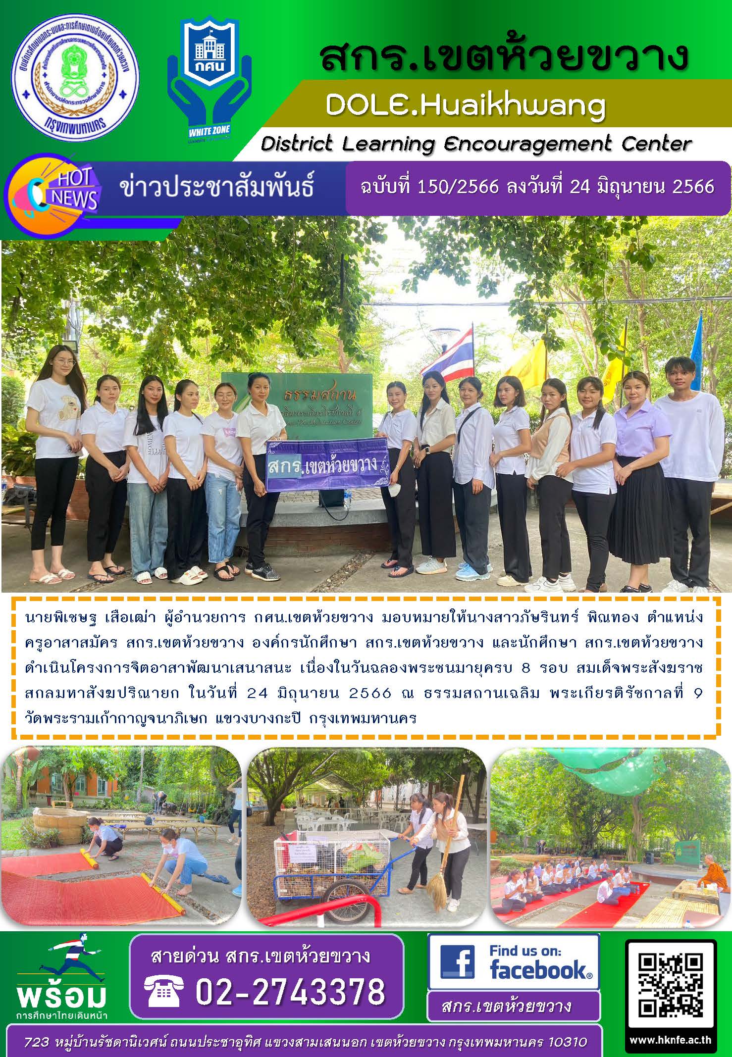 นายพิเชษฐ เสือเฒ่า ผู้อำนวยการ กศน.เขตห้วยขวาง มอบหมายให้นางสาวภัษรินทร์ พิณทอง ตำแหน่งครูอาสาสมัคร สกร.เขตห้วยขวาง องค์กรนักศึกษา สกร.เขตห้วยขวาง และนักศึกษา สกร.เขตห้วยขวาง ดำเนินโครงการจิตอาสาพัฒนาเสนาสนะ เนื่องในวันฉลองพระชนมายุครบ 8 รอบ สมเด็จพระสังฆราช สกลมหาสังฆปริณายก ในวันที่ 24 มิถุนายน 2566 ณ ธรรมสถานเฉลิม พระเกียรติรัชกาลที่ 9 วัดพระรามเก้ากาญจนาภิเษก แขวงบางกะปิ กรุงเทพมหานคร