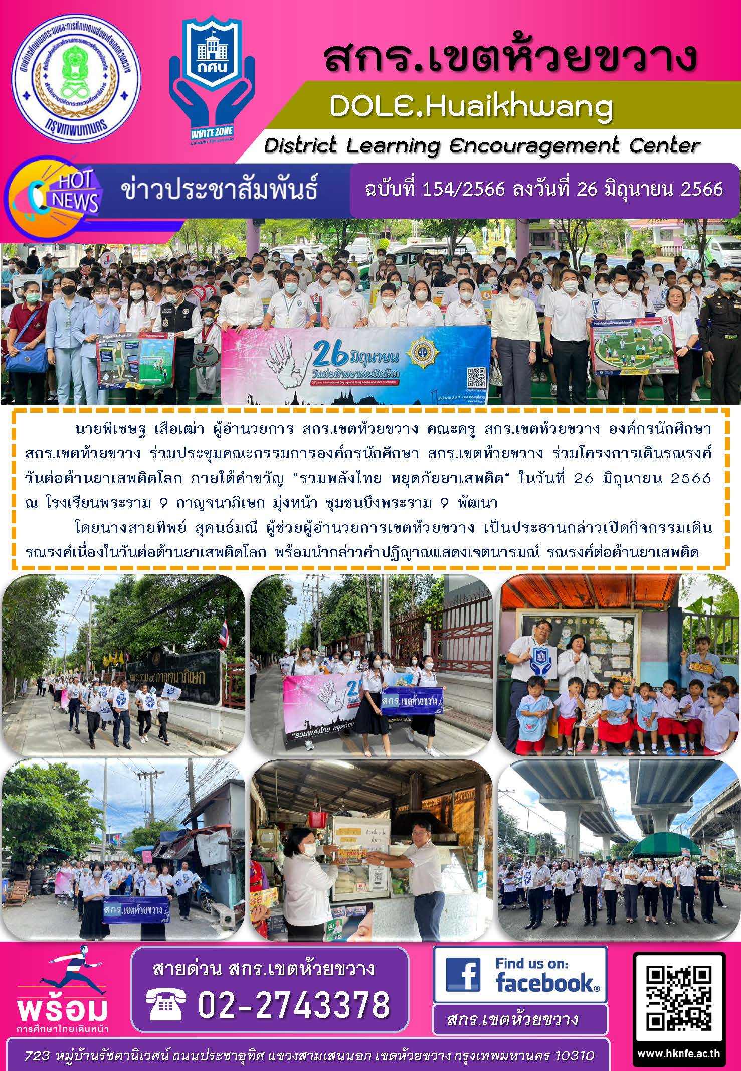 นายพิเชษฐ เสือเฒ่า ผู้อำนวยการ สกร.เขตห้วยขวาง คณะครู สกร.เขตห้วยขวาง องค์กรนักศึกษา สกร.เขตห้วยขวาง ร่วมประชุมคณะกรรมการองค์กรนักศึกษา สกร.เขตห้วยขวาง ร่วมโครงการเดินรณรงค์วันต่อต้านยาเสพติดโลก ภายใต้คำขวัญ "รวมพลังไทย หยุดภัยยาเสพติด" ในวันที่ 26 มิถุนายน 2566 ณ โรงเรียนพระราม 9 กาญจนาภิเษก มุ่งหน้า ชุมชนบึงพระราม 9 พัฒนา
