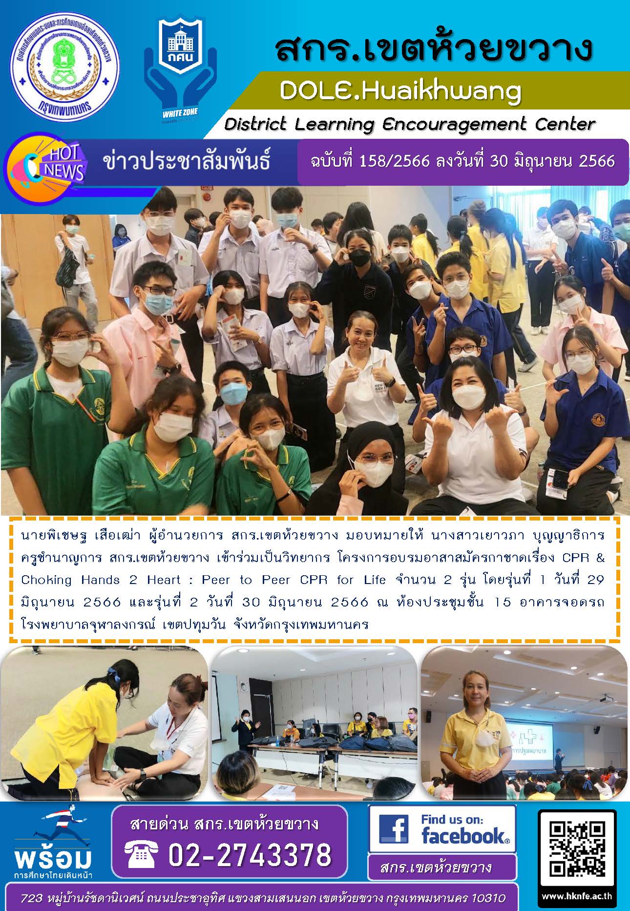 นายพิเชษฐ เสือเฒ่า ผู้อำนวยการ สกร.เขตห้วยขวาง มอบหมายให้ นางสาวเยาวภา บุญญาธิการ ครูชำนาญการ สกร.เขตห้วยขวาง เข้าร่วมเป็นวิทยากร โครงการอบรมอาสาสมัครกาชาดเรื่อง CPR & Choking Hands 2 Heart : Peer to Peer CPR for Life จำนวน 2 รุ่น โดยรุ่นที่ 1 วันที่ 29 มิถุนายน 2566 และรุ่นที่ 2 วันที่ 30 มิถุนายน 2566 ณ ห้องประชุมชั้น 15 อาคารจอดรถ โรงพยาบาลจุฬาลงกรณ์ เขตปทุมวัน จังหวัดกรุงเทพมหานคร