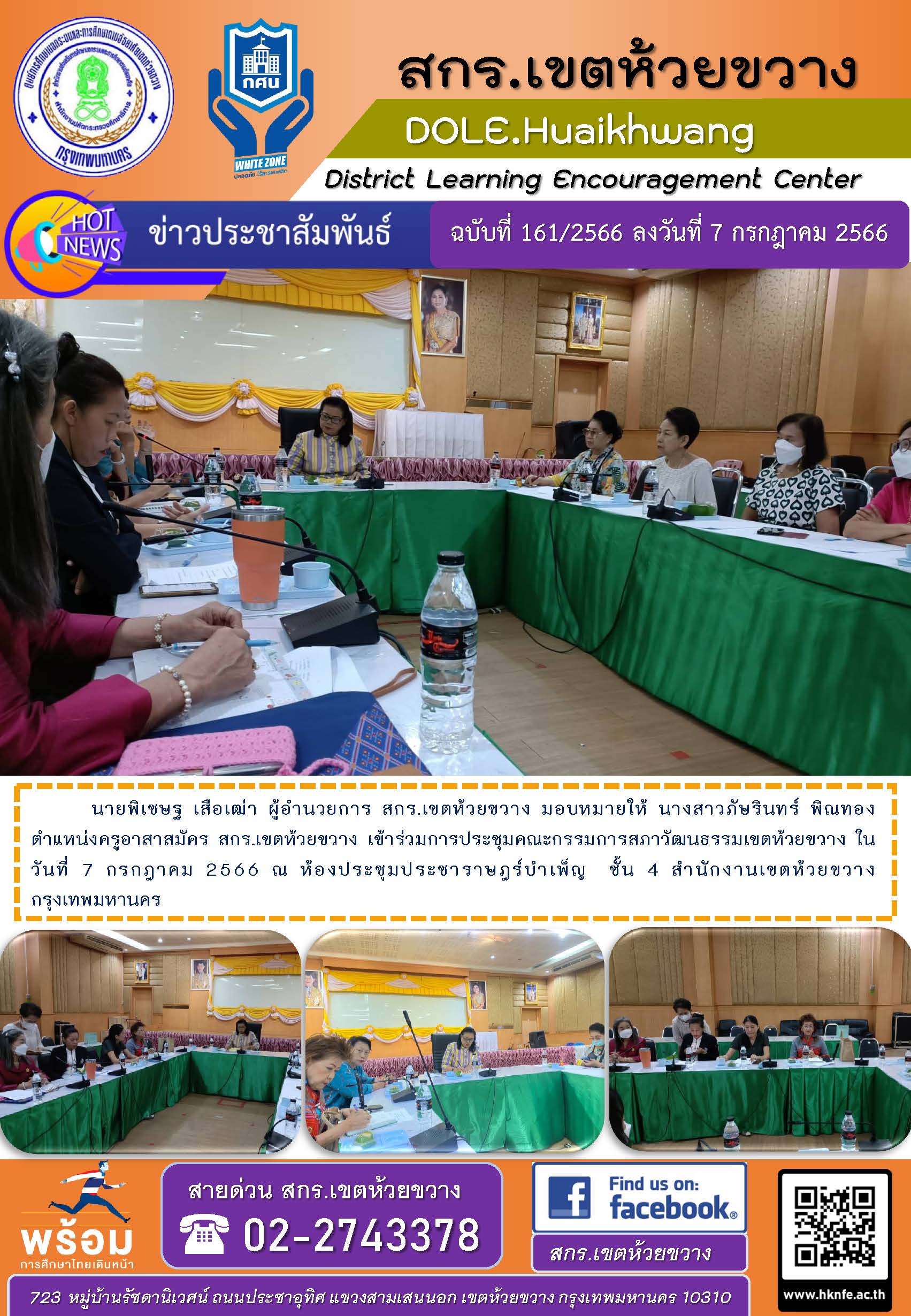 นายพิเชษฐ เสือเฒ่า ผู้อำนวยการ สกร.เขตห้วยขวาง มอบหมายให้ นางสาวภัษรินทร์ พิณทอง ตำแหน่งครูอาสาสมัคร สกร.เขตห้วยขวาง เข้าร่วมการประชุมคณะกรรมการสภาวัฒนธรรมเขตห้วยขวาง ในวันที่ 7 กรกฎาคม 2566 ณ ห้องประชุมประชาราษฎร์บำเพ็ญ ชั้น 4 สำนักงานเขตห้วยขวาง กรุงเทพมหานคร