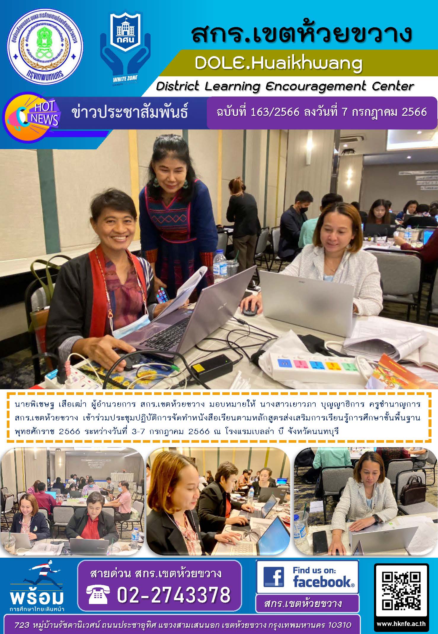 นายพิเชษฐ เสือเฒ่า ผู้อำนวยการ สกร.เขตห้วยขวาง มอบหมายให้ นางสาวเยาวภา บุญญาธิการ ครูชำนาญการ สกร.เขตห้วยขวาง เข้าร่วมประชุมปฏิบัติการจัดทำหนังสือเรียนตามหลักสูตรส่งเสริมการเรียนรู้การศึกษาขั้นพื้นฐานพุทธศักราช 2566 ระหว่างวันที่ 3-7 กรกฎาคม 2566 ณ โรงแรมเบลล่า บี จังหวัดนนทบุรี