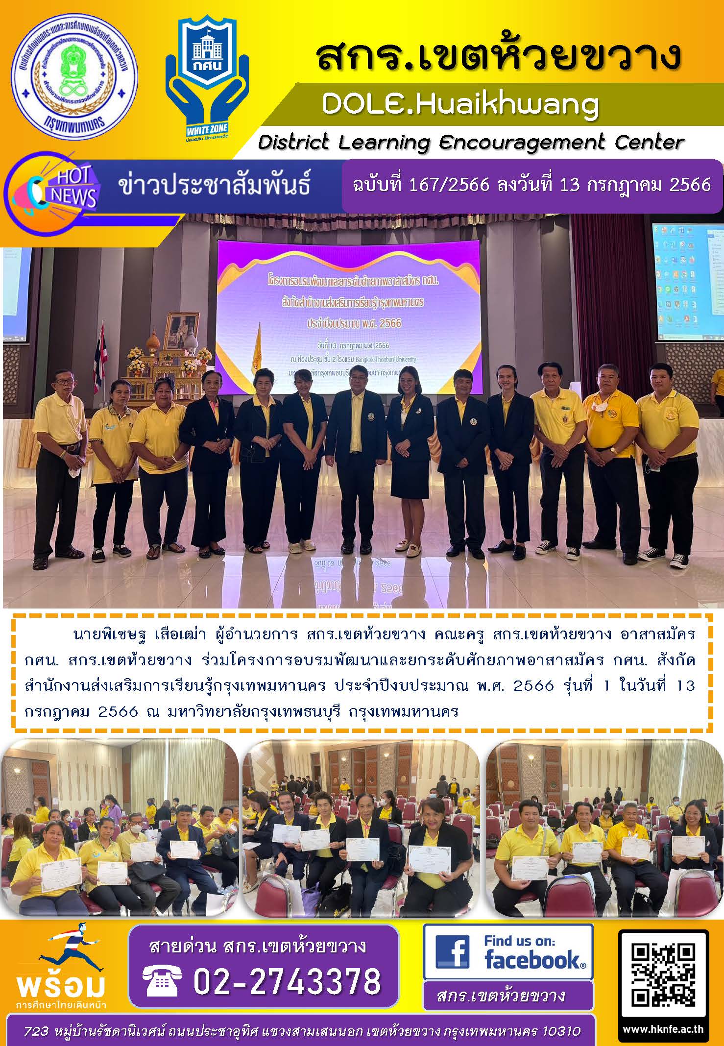 นายพิเชษฐ เสือเฒ่า ผู้อำนวยการ สกร.เขตห้วยขวาง คณะครู สกร.เขตห้วยขวาง อาสาสมัคร กศน. สกร.เขตห้วยขวาง ร่วมโครงการอบรมพัฒนาและยกระดับศักยภาพอาสาสมัคร กศน. สังกัดสำนักงานส่งเสริมการเรียนรู้กรุงเทพมหานคร ประจำปีงบประมาณ พ.ศ. 2566 รุ่นที่ 1 ในวันที่ 13 กรกฎาคม 2566 ณ มหาวิทยาลัยกรุงเทพธนบุรี กรุงเทพมหานคร