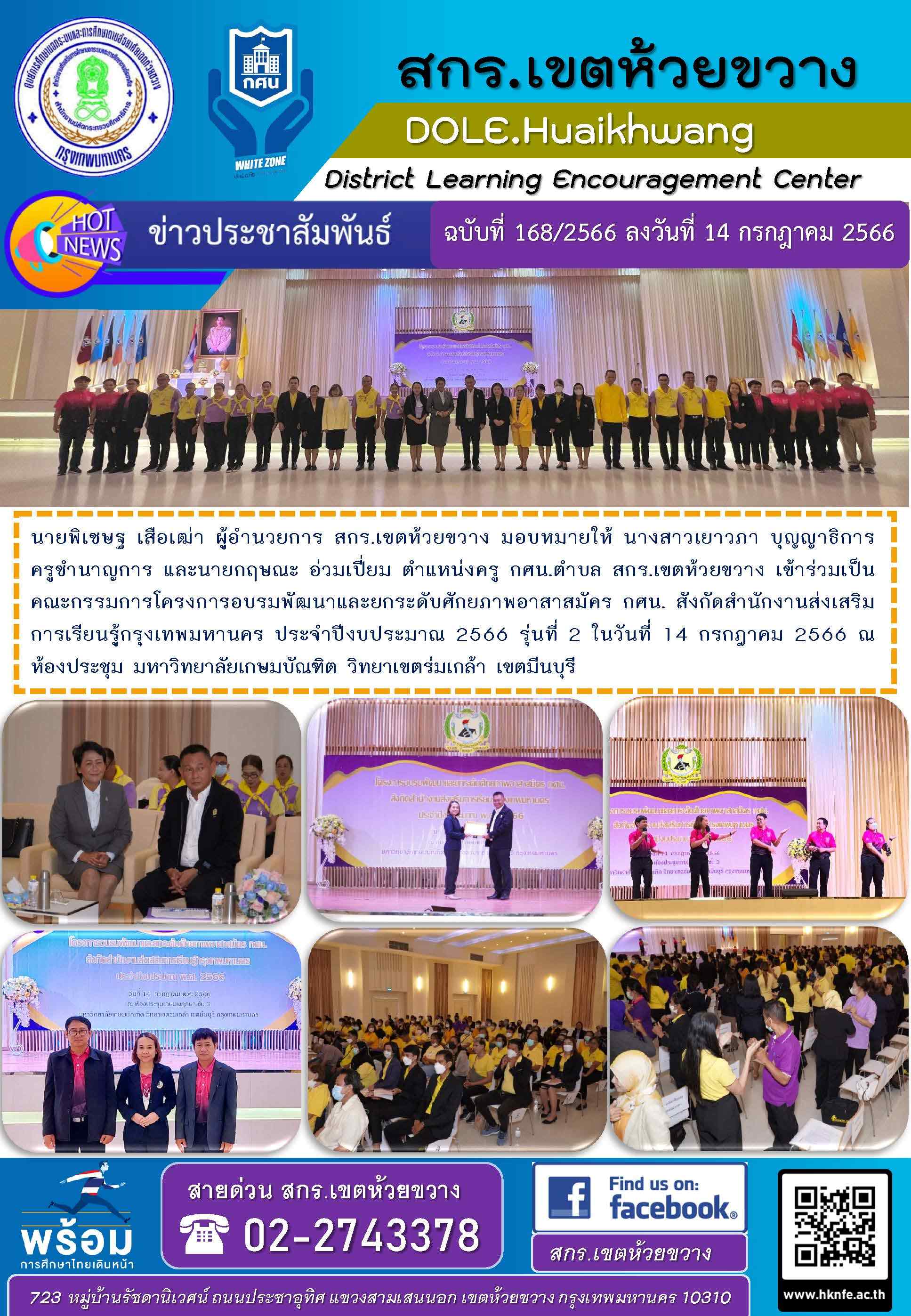 นายพิเชษฐ เสือเฒ่า ผู้อำนวยการ สกร.เขตห้วยขวาง มอบหมายให้ นางสาวเยาวภา บุญญาธิการ ครูชำนาญการ และนายกฤษณะ อ่วมเปี่ยม ตำแหน่งครู กศน.ตำบล สกร.เขตห้วยขวาง เข้าร่วมเป็นคณะกรรมการโครงการอบรมพัฒนาและยกระดับศักยภาพอาสาสมัคร กศน. สังกัดสำนักงานส่งเสริมการเรียนรู้กรุงเทพมหานคร ประจำปีงบประมาณ 2566 รุ่นที่ 2 ในวันที่ 14 กรกฎาคม 2566 ณ ห้องประชุม มหาวิทยาลัยเกษมบัณฑิต วิทยาเขตร่มเกล้า เขตมีนบุรี