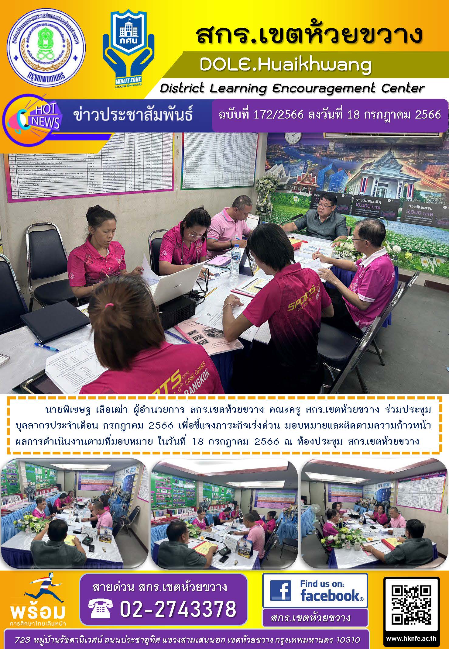 นายพิเชษฐ เสือเฒ่า ผู้อำนวยการ สกร.เขตห้วยขวาง คณะครู สกร.เขตห้วยขวาง ร่วมประชุมบุคลากรประจำเดือน กรกฎาคม 2566 เพื่อชี้แจงภาระกิจเร่งด่วน มอบหมายและติดตามความก้าวหน้าผลการดำเนินงานตามที่มอบหมาย ในวันที่ 18 กรกฎาคม 2566 ณ ห้องประชุม สกร.เขตห้วยขวาง