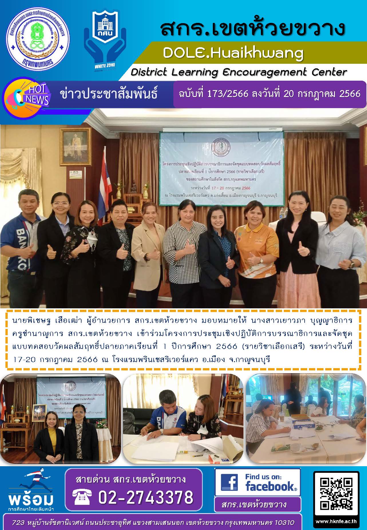 นายพิเชษฐ เสือเฒ่า ผู้อำนวยการ สกร.เขตห้วยขวาง มอบหมายให้ นางสาวเยาวภา บุญญาธิการ ครูชำนาญการ สกร.เขตห้วยขวาง เข้าร่วมโครงการประชุมเชิงปฏิบัติการบรรณาธิการและจัดชุดแบบทดสอบวัดผลสัมฤทธิ์ปลายภาคเรียนที่ 1 ปีการศึกษา 2566 (รายวิชาเลือกเสรี) ระหว่างวันที่ 17-20 กรกฎาคม 2566 ณ โรงแรมพรินเซสริเวอร์แคว อ.เมือง จ.กาญจนบุรี