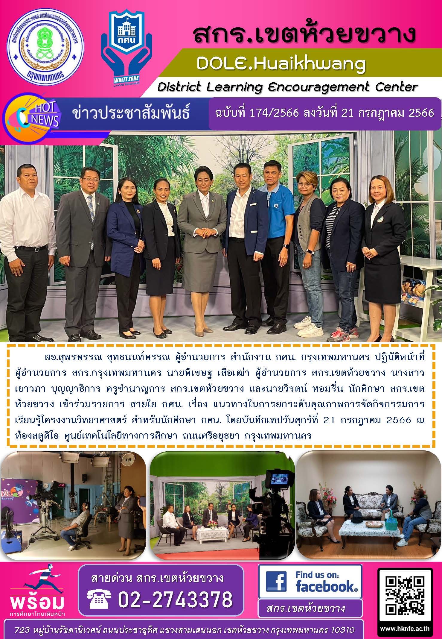 ผอ.สุพรพรรณ สุทธนนท์พรรณ ผู้อำนวยการ สำนักงาน กศน. กรุงเทพมหานคร ปฏิบัติหน้าที่ ผู้อำนวยการ สกร. กรุงเทพมหานคร นายพิเชษฐ เสือเฒ่า ผู้อำนวยการ สกร.เขตห้วยขวาง นางสาวเยาวภา บุญญาธิการ ครูชำนาญการ สกร.เขตห้วยขวาง และนายวิรตน์ หอมรื่น นักศึกษา สกร.เขตห้วยขวาง เข้าร่วมรายการ สายใย กศน. เรื่อง แนวทางในการยกระดับคุณภาพการจัดกิจกรรมการเรียนรู้โครงงานวิทยาศาสตร์ สำหรับนักศึกษา กศน. โดยบันทึกเทปวันศุกร์ที่ 21 กรกฎาคม 2566 ณ ห้องสตูดิโอ ศูนย์เทคโนโลยีทางการศึกษา ถนนศรีอยุธยา กรุงเทพมหานคร