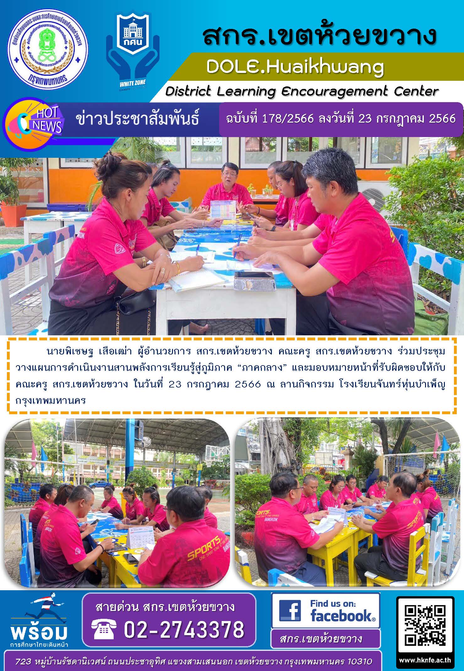 นายพิเชษฐ เสือเฒ่า ผู้อำนวยการ สกร.เขตห้วยขวาง คณะครู สกร.เขตห้วยขวาง ร่วมประชุมวางแผนการดำเนินงานสานพลังการเรียนรู้สู่ภูมิภาค “ภาคกลาง” และมอบหมายหน้าที่รับผิดชอบให้กับคณะครู สกร.เขตห้วยขวาง ในวันที่ 23 กรกฎาคม 2566 ณ ลานกิจกรรม โรงเรียนจันทร์หุ่นบำเพ็ญ กรุงเทพมหานคร