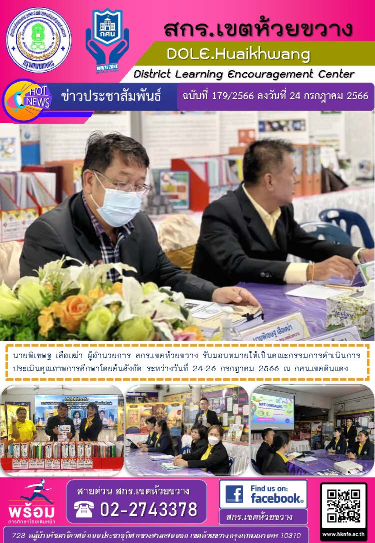 นายพิเชษฐ เสือเฒ่า ผู้อำนวยการ สกร.เขตห้วยขวาง รับมอบหมายให้เป็นคณะกรรมการดำเนินการประเมินคุณภาพการศึกษาโดยต้นสังกัด ระหว่างวันที่ 24-26 กรกฎาคม 2566 ณ กศน.เขตดินแดง