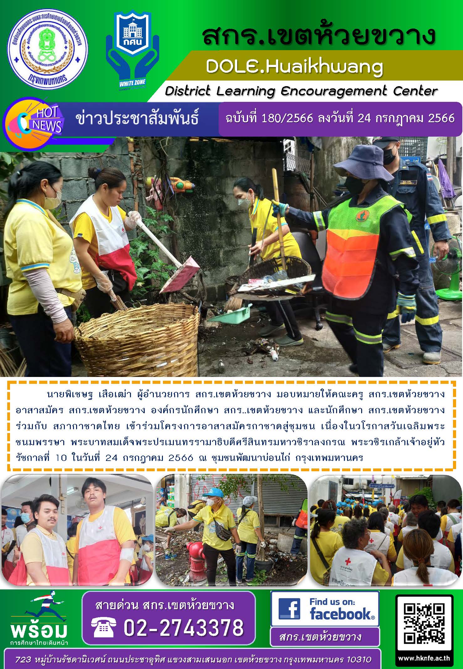 นายพิเชษฐ เสือเฒ่า ผู้อำนวยการ สกร.เขตห้วยขวาง มอบหมายให้คณะครู สกร.เขตห้วยขวาง อาสาสมัคร สกร.เขตห้วยขวาง องค์กรนักศึกษา สกร..เขตห้วยขวาง และนักศึกษา สกร.เขตห้วยขวาง ร่วมกับ สภากาชาดไทย เข้าร่วมโครงการอาสาสมัครกาชาดสู่ชุมชน เนื่องในวโรกาสวันเฉลิมพระชนมพรรษา พระบาทสมเด็จพระปรเมนทรรามาธิบดีศรีสินทรมหาวชิราลงกรณ พระวชิรเกล้าเจ้าอยู่หัว รัชกาลที่ 10 ในวันที่ 24 กรกฎาคม 2566 ณ ชุมชนพัฒนาบ่อนไก่ กรุงเทพมหานคร