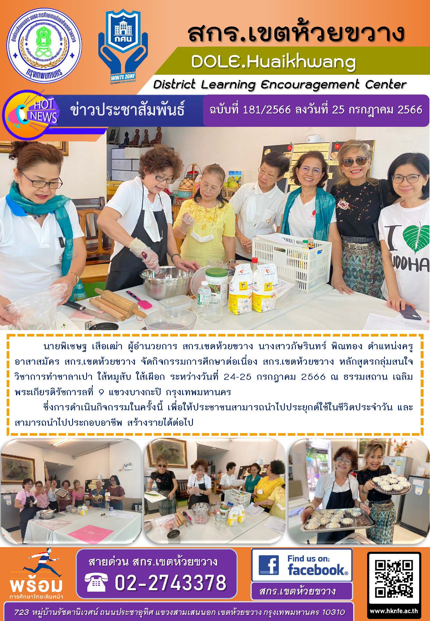 นายพิเชษฐ เสือเฒ่า ผู้อำนวยการ สกร.เขตห้วยขวาง นางสาวภัษรินทร์ พิณทอง ตำแหน่งครูอาสาสมัคร สกร.เขตห้วยขวาง จัดกิจกรรมการศึกษาต่อเนื่อง สกร.เขตห้วยขวาง หลักสูตรกลุ่มสนใจ วิชาการทำซาลาเปา ใส้หมูสับ ใส้เผือก ระหว่างวันที่ 24-25 กรกฎาคม 2566 ณ ธรรมสถาน เฉลิมพระเกียรติรัชการลที่ 9 แขวงบางกะปิ กรุงเทพมหานคร