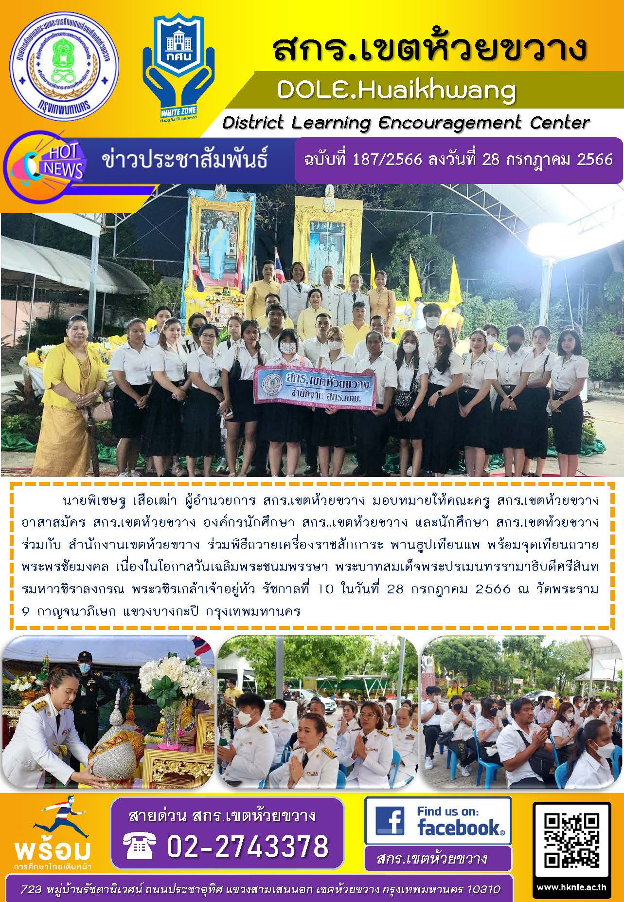 นายพิเชษฐ เสือเฒ่า ผู้อำนวยการ สกร.เขตห้วยขวาง มอบหมายให้คณะครู สกร.เขตห้วยขวาง อาสาสมัคร สกร.เขตห้วยขวาง องค์กรนักศึกษา สกร..เขตห้วยขวาง และนักศึกษา สกร.เขตห้วยขวาง ร่วมกับ สำนักงานเขตห้วยขวาง ร่วมพิธีถวายเครื่องราชสักการะ พานธูปเทียนแพ พร้อมจุดเทียนถวายพระพรชัยมงคล เนื่องในโอกาสวันเฉลิมพระชนมพรรษา พระบาทสมเด็จพระปรเมนทรรามาธิบดีศรีสินทรมหาวชิราลงกรณ พระวชิรเกล้าเจ้าอยู่หัว รัชกาลที่ 10 ในวันที่ 28 กรกฎาคม 2566 ณ วัดพระราม 9 กาญจนาภิเษก แขวงบางกะปิ กรุงเทพมหานคร