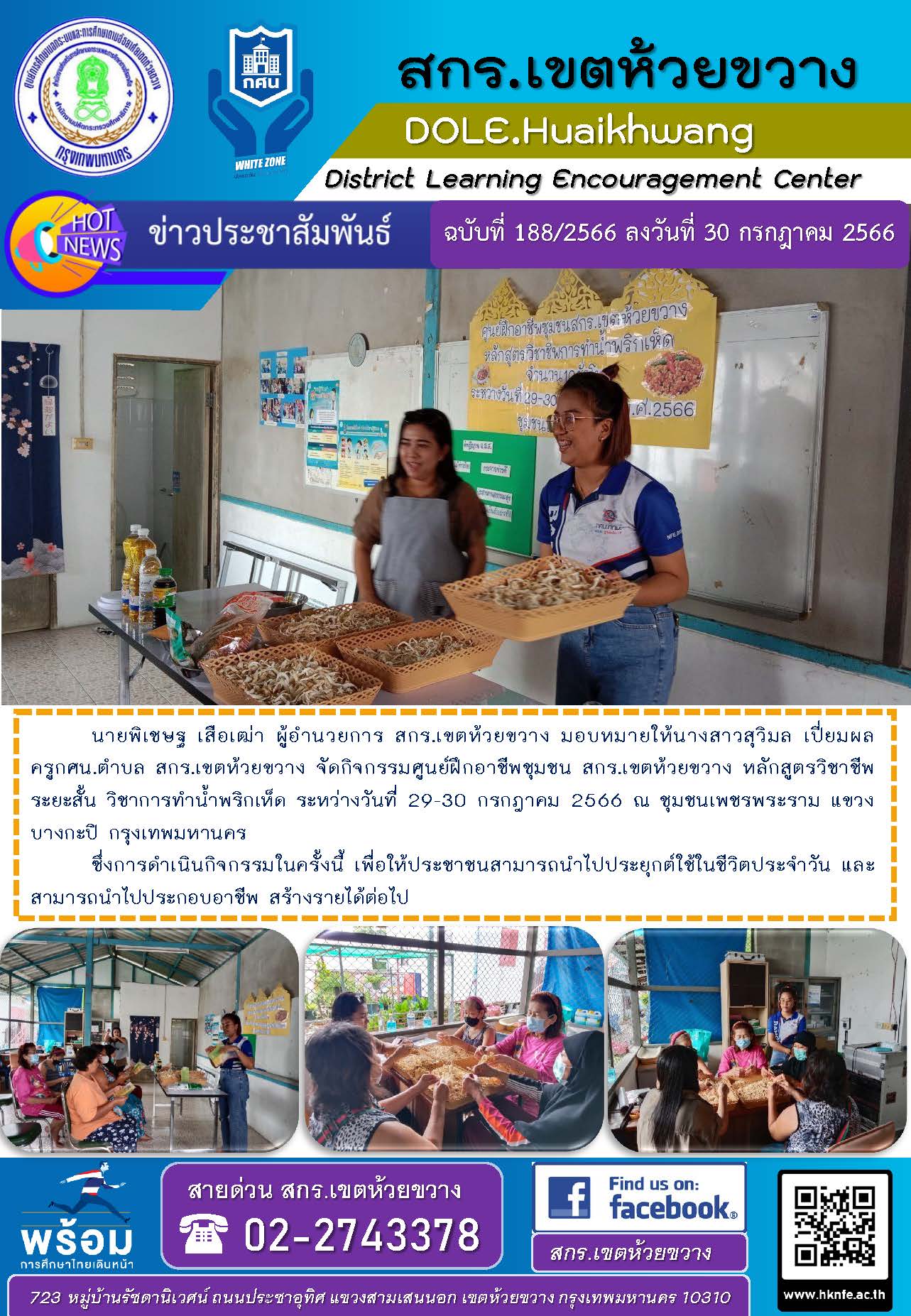 นายพิเชษฐ เสือเฒ่า ผู้อำนวยการ สกร.เขตห้วยขวาง มอบหมายให้นางสาวสุวิมล เปี่ยมผล ครูกศน.ตำบล สกร.เขตห้วยขวาง จัดกิจกรรมศูนย์ฝึกอาชีพชุมชน สกร.เขตห้วยขวาง หลักสูตรวิชาชีพระยะสั้น วิชาการทำน้ำพริกเห็ด ระหว่างวันที่ 29-30 กรกฎาคม 2566 ณ ชุมชนเพชรพระราม แขวงบางกะปิ กรุงเทพมหานคร