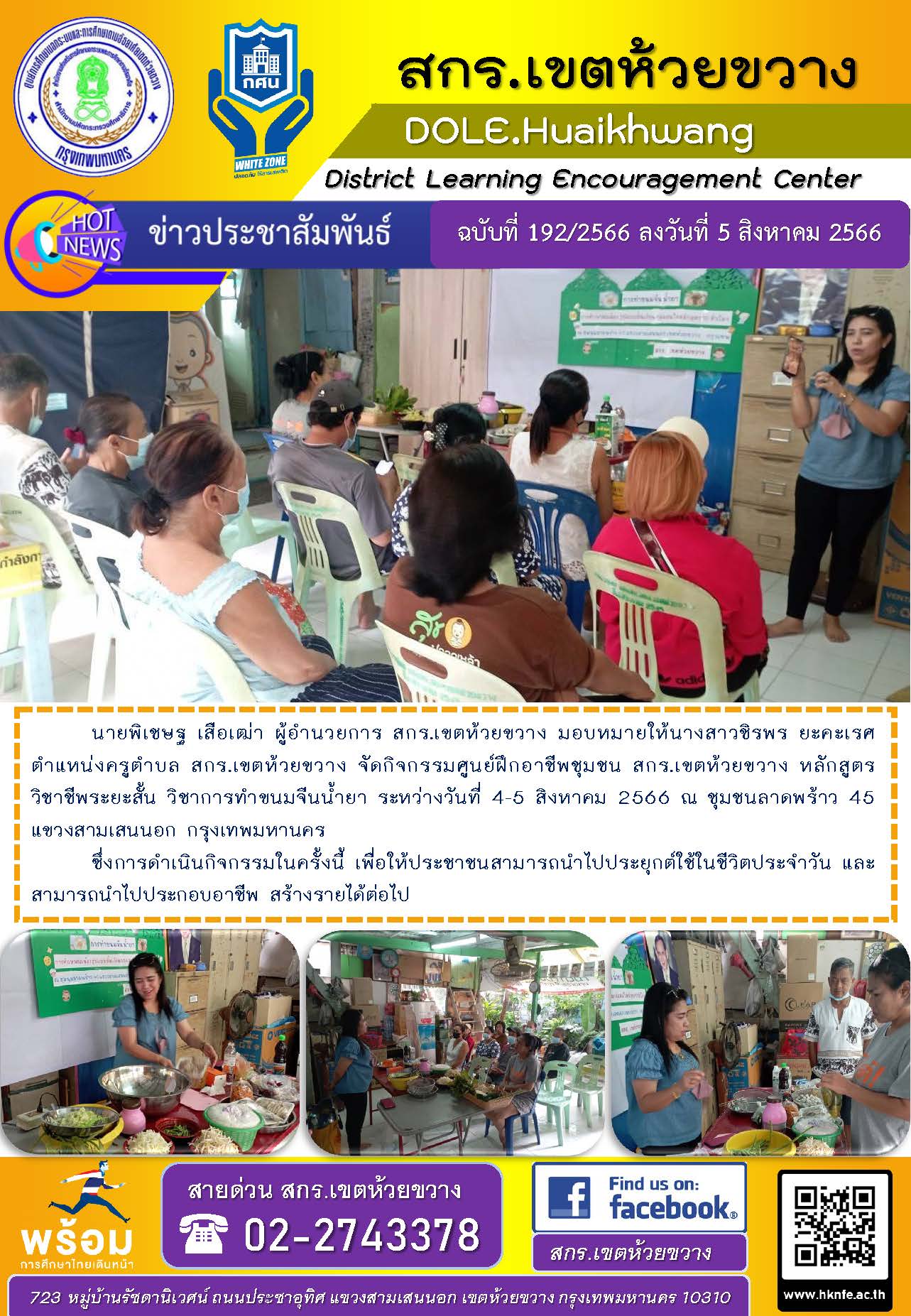 นายพิเชษฐ เสือเฒ่า ผู้อำนวยการ สกร.เขตห้วยขวาง มอบหมายให้นางสาวชิรพร ยะคะเรศ ตำแหน่งครูตำบล สกร.เขตห้วยขวาง จัดกิจกรรมศูนย์ฝึกอาชีพชุมชน สกร.เขตห้วยขวาง หลักสูตรวิชาชีพระยะสั้น วิชาการทำขนมจีนน้ำยา ระหว่างวันที่ 4-5 สิงหาคม 2566 ณ ชุมชนลาดพร้าว 45 แขวงสามเสนนอก กรุงเทพมหานคร