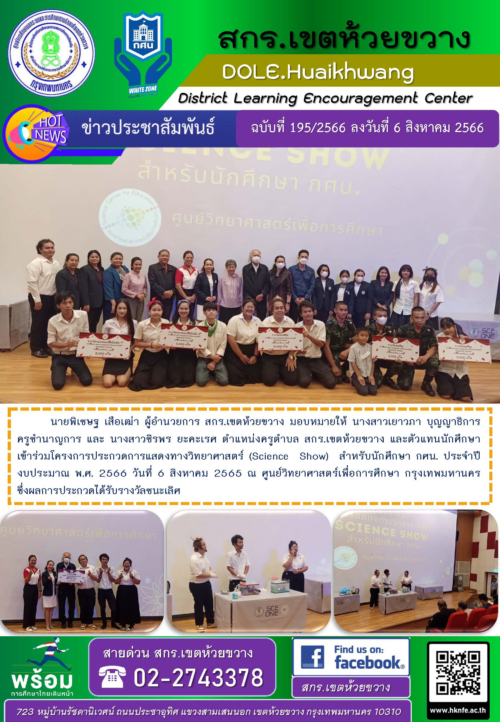 นายพิเชษฐ เสือเฒ่า ผู้อำนวยการ สกร.เขตห้วยขวาง มอบหมายให้ นางสาวเยาวภา บุญญาธิการ ครูชำนาญการ และ นางสาวชิรพร ยะคะเรศ ตำแหน่งครูตำบล สกร.เขตห้วยขวาง และตัวแทนนักศึกษาเข้าร่วมโครงการประกวดการแสดงทางวิทยาศาสตร์ (Science Show) สำหรับนักศึกษา กศน. ประจำปีงบประมาณ พ.ศ. 2566 วันที่ 6 สิงหาคม 2565 ณ ศูนย์วิทยาศาสตร์เพื่อการศึกษา กรุงเทพมหานคร ซึ่งผลการประกวดได้รับรางวัลชนะเลิศ