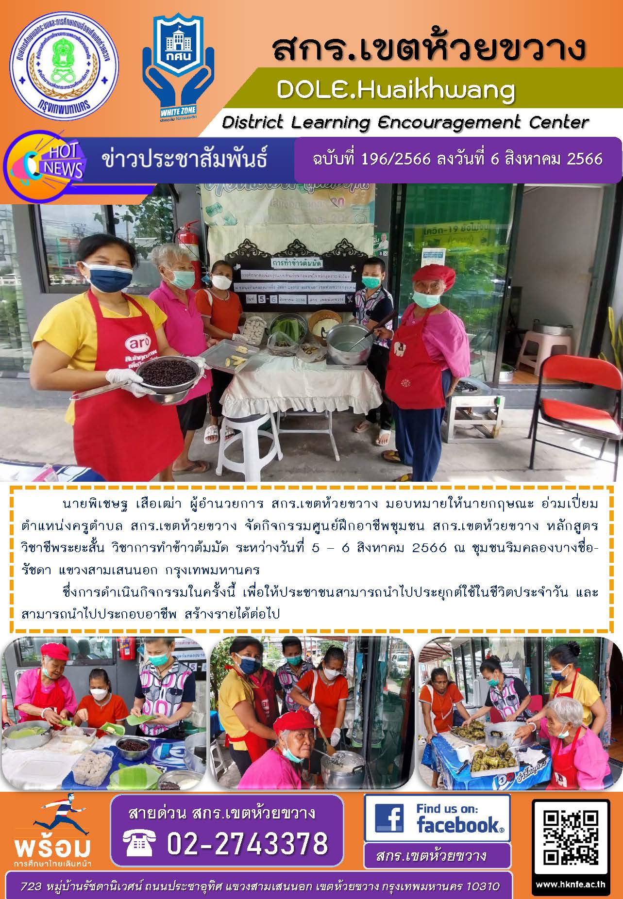 นายพิเชษฐ เสือเฒ่า ผู้อำนวยการ สกร.เขตห้วยขวาง มอบหมายให้นายกฤษณะ อ่วมเปี่ยม ตำแหน่งครูตำบล สกร.เขตห้วยขวาง จัดกิจกรรมศูนย์ฝึกอาชีพชุมชน สกร.เขตห้วยขวาง หลักสูตรวิชาชีพระยะสั้น วิชาการทำข้าวต้มมัด ระหว่างวันที่ 5 – 6 สิงหาคม 2566 ณ ชุมชนริมคลองบางซื่อ-รัชดา แขวงสามเสนนอก กรุงเทพมหานคร