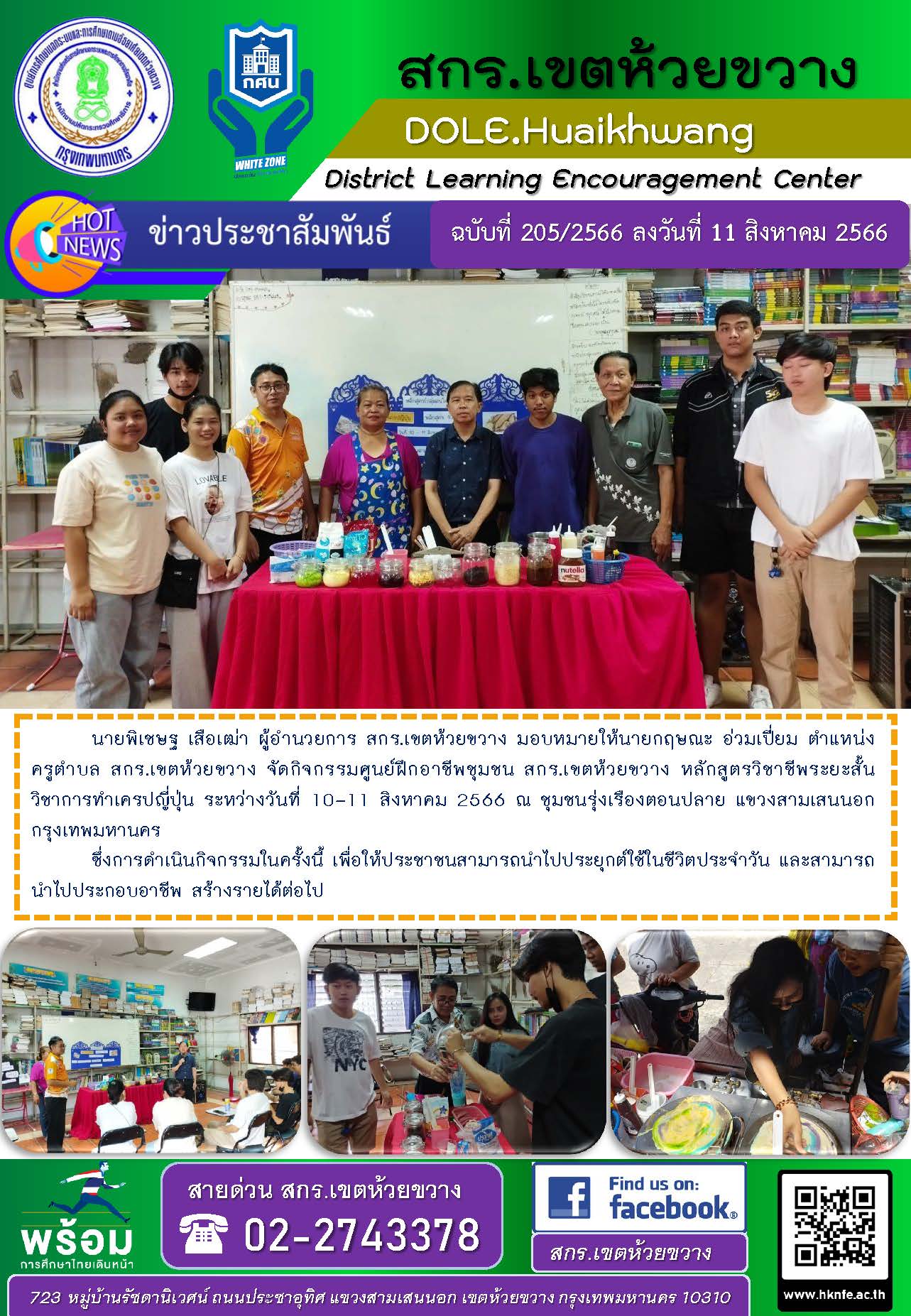 นายพิเชษฐ เสือเฒ่า ผู้อำนวยการ สกร.เขตห้วยขวาง มอบหมายให้นายกฤษณะ อ่วมเปี่ยม ตำแหน่งครูตำบล สกร.เขตห้วยขวาง จัดกิจกรรมศูนย์ฝึกอาชีพชุมชน สกร.เขตห้วยขวาง หลักสูตรวิชาชีพระยะสั้น วิชาการทำเครปญี่ปุ่น ระหว่างวันที่ 10 – 11 สิงหาคม 2566 ณ ชุมชนรุ่งเรืองตอนปลาย แขวงสามเสนนอก กรุงเทพมหานคร