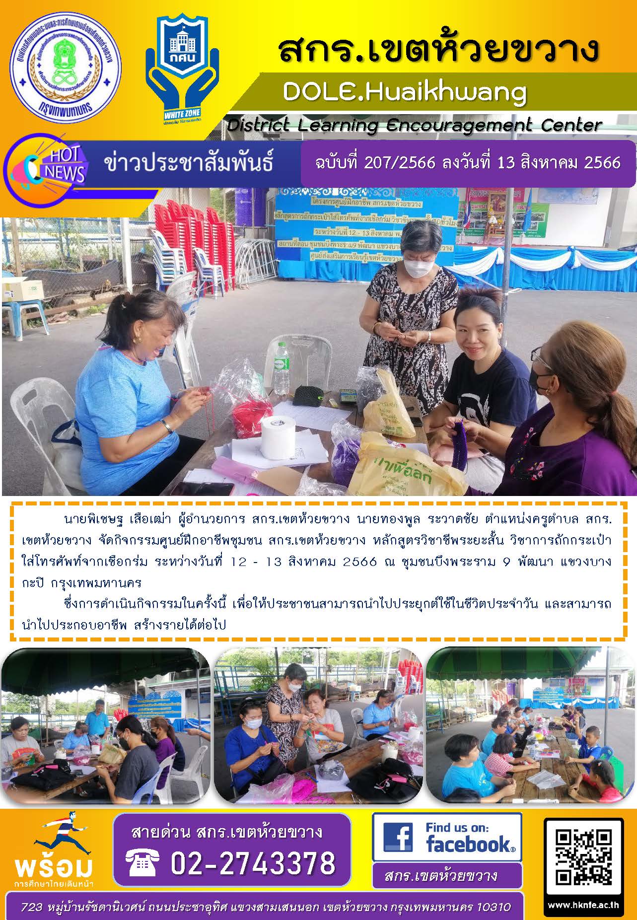 นายพิเชษฐ เสือเฒ่า ผู้อำนวยการ สกร.เขตห้วยขวาง นายทองพูล ระวาดชัย ตำแหน่งครูตำบล สกร.เขตห้วยขวาง จัดกิจกรรมศูนย์ฝึกอาชีพชุมชน สกร.เขตห้วยขวาง หลักสูตรวิชาชีพระยะสั้น วิชาการถักกระเป๋าใส่โทรศัพท์จากเชือกร่ม ระหว่างวันที่ 12 - 13 สิงหาคม 2566 ณ ชุมชนบึงพระราม 9 พัฒนา แขวงบางกะปิ กรุงเทพมหานคร