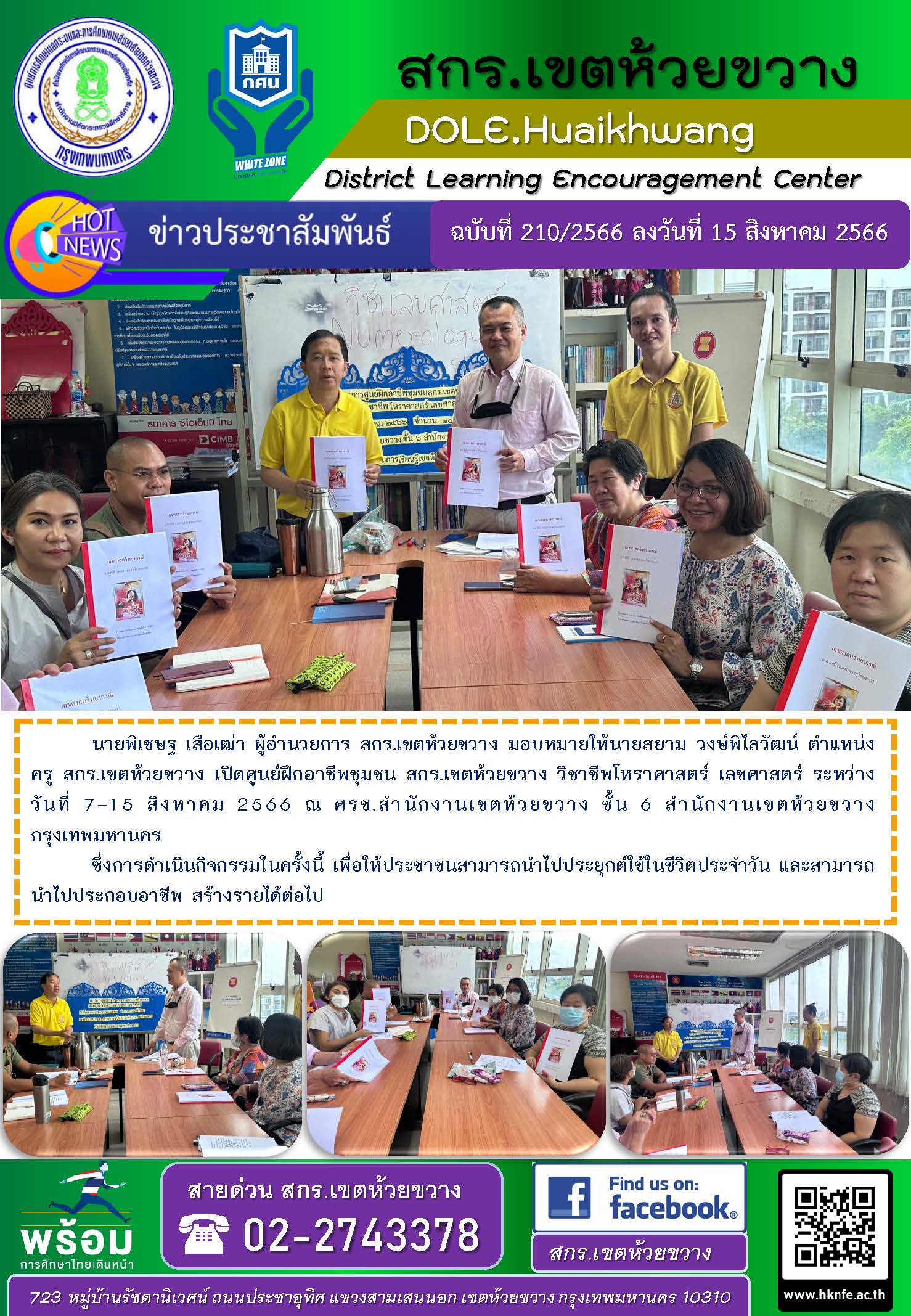 นายพิเชษฐ เสือเฒ่า ผู้อำนวยการ สกร.เขตห้วยขวาง มอบหมายให้นายสยาม วงษ์พิไลวัฒน์ ตำแหน่งครู สกร.เขตห้วยขวาง เปิดศูนย์ฝึกอาชีพชุมชน สกร.เขตห้วยขวาง วิชาชีพโหราศาสตร์ เลขศาสตร์ ระหว่างวันที่ 7 – 15 สิงหาคม 2566 ณ ศรช.สำนักงานเขตห้วยขวาง ชั้น 6 สำนักงานเขตห้วยขวาง กรุงเทพมหานคร