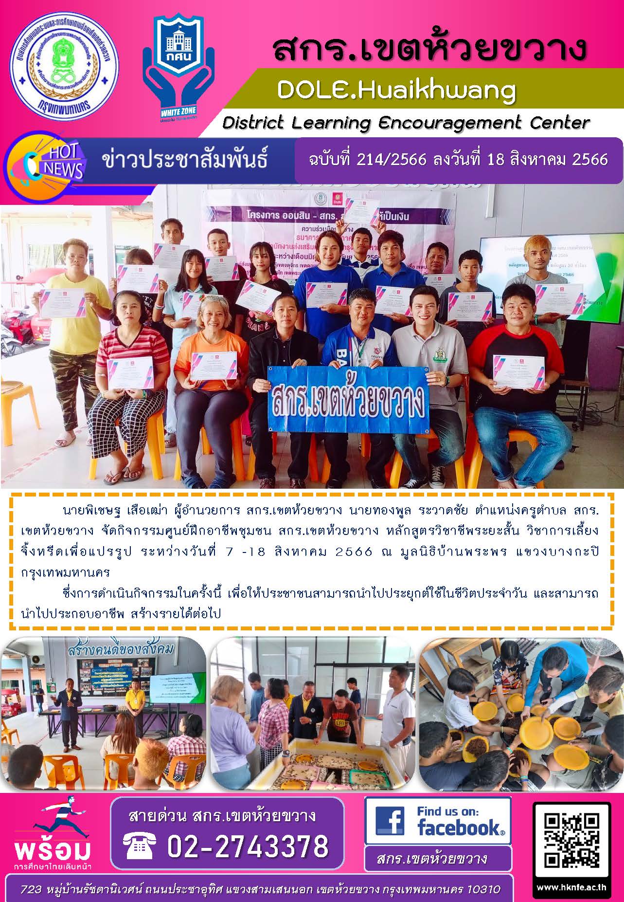 นายพิเชษฐ เสือเฒ่า ผู้อำนวยการ สกร.เขตห้วยขวาง นายทองพูล ระวาดชัย ตำแหน่งครูตำบล สกร.เขตห้วยขวาง จัดกิจกรรมศูนย์ฝึกอาชีพชุมชน สกร.เขตห้วยขวาง หลักสูตรวิชาชีพระยะสั้น วิชาการเลี้ยงจิ้งหรีดเพื่อแปรรูป ระหว่างวันที่ 7 -18 สิงหาคม 2566 ณ มูลนิธิบ้านพระพร แขวงบางกะปิ กรุงเทพมหานคร