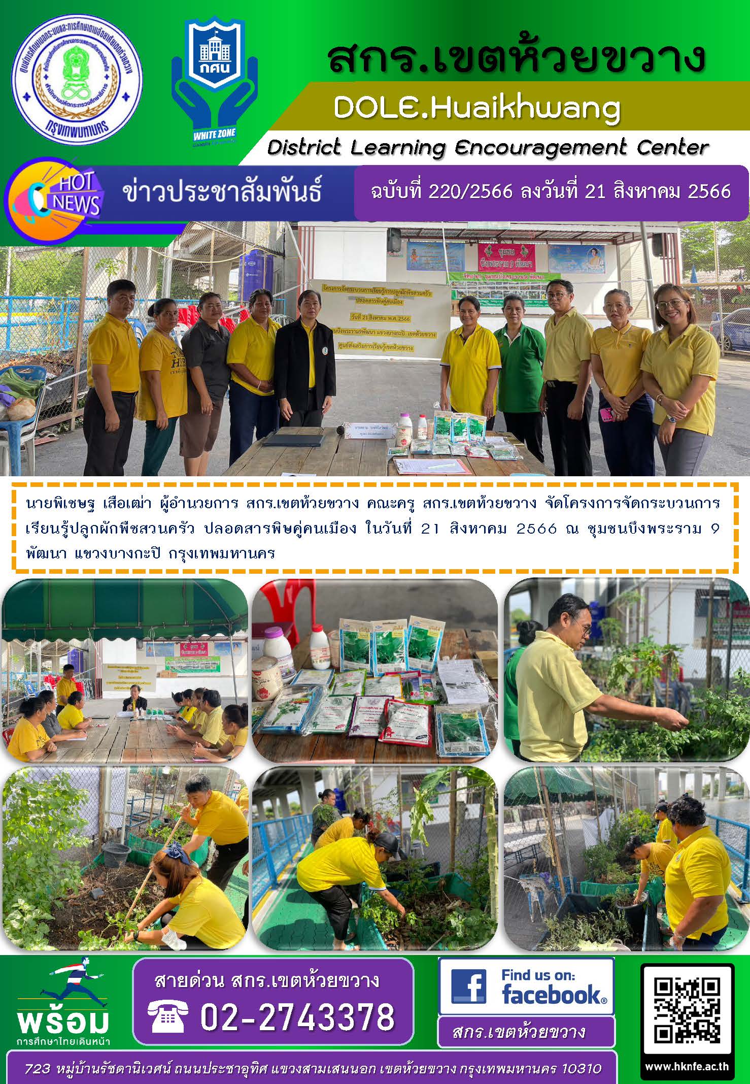 นายพิเชษฐ เสือเฒ่า ผู้อำนวยการ สกร.เขตห้วยขวาง คณะครู สกร.เขตห้วยขวาง จัดโครงการจัดกระบวนการเรียนรู้ปลูกผักพืชสวนครัว ปลอดสารพิษคู่คนเมือง ในวันที่ 21 สิงหาคม 2566 ณ ชุมชนบึงพระราม 9 พัฒนา แขวงบางกะปิ กรุงเทพมหานคร