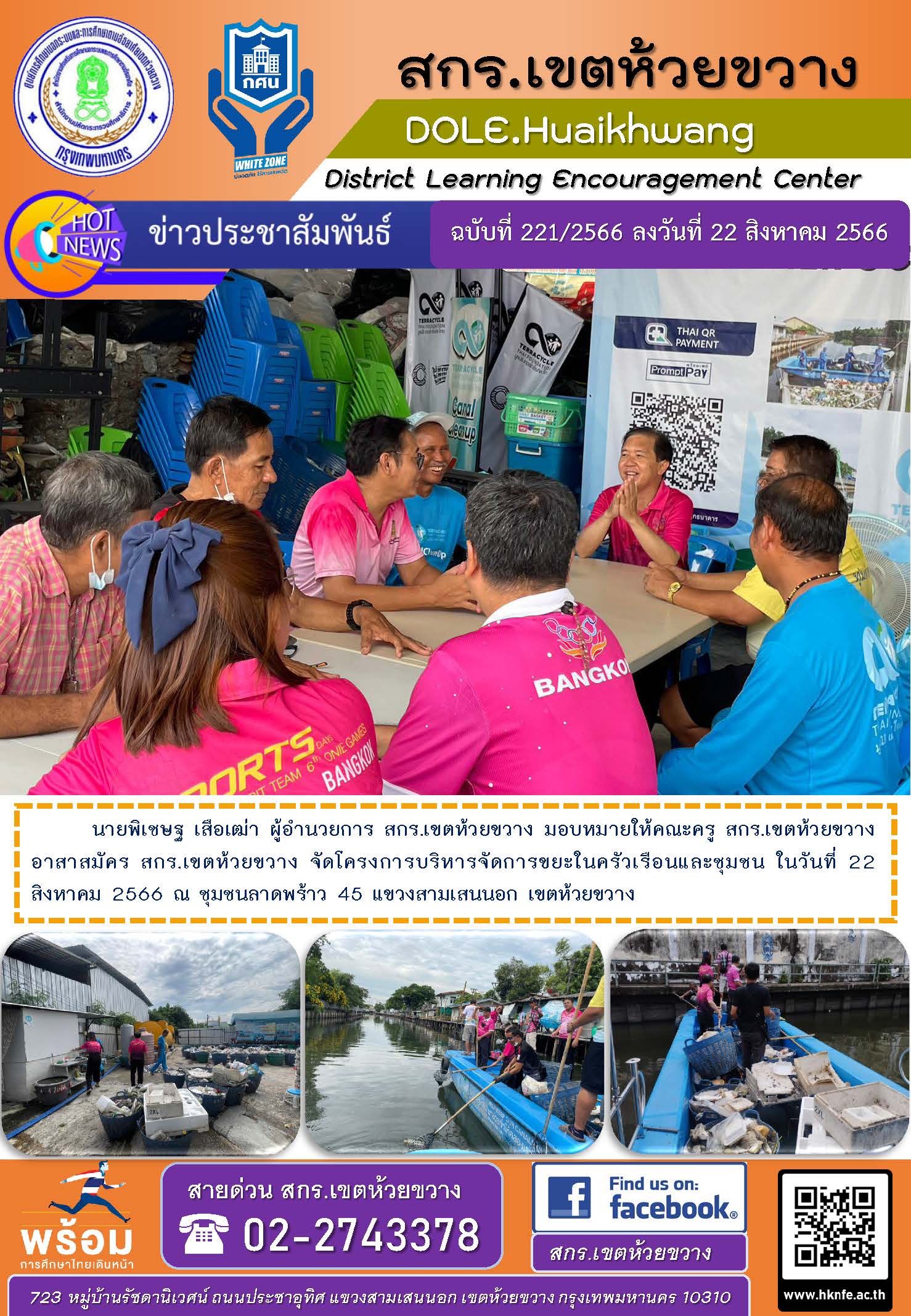 นายพิเชษฐ เสือเฒ่า ผู้อำนวยการ สกร.เขตห้วยขวาง มอบหมายให้คณะครู สกร.เขตห้วยขวาง อาสาสมัคร สกร.เขตห้วยขวาง จัดโครงการบริหารจัดการขยะในครัวเรือนและชุมชน ในวันที่ 22 สิงหาคม 2566 ณ ชุมชนลาดพร้าว 45 แขวงสามเสนนอก เขตห้วยขวาง