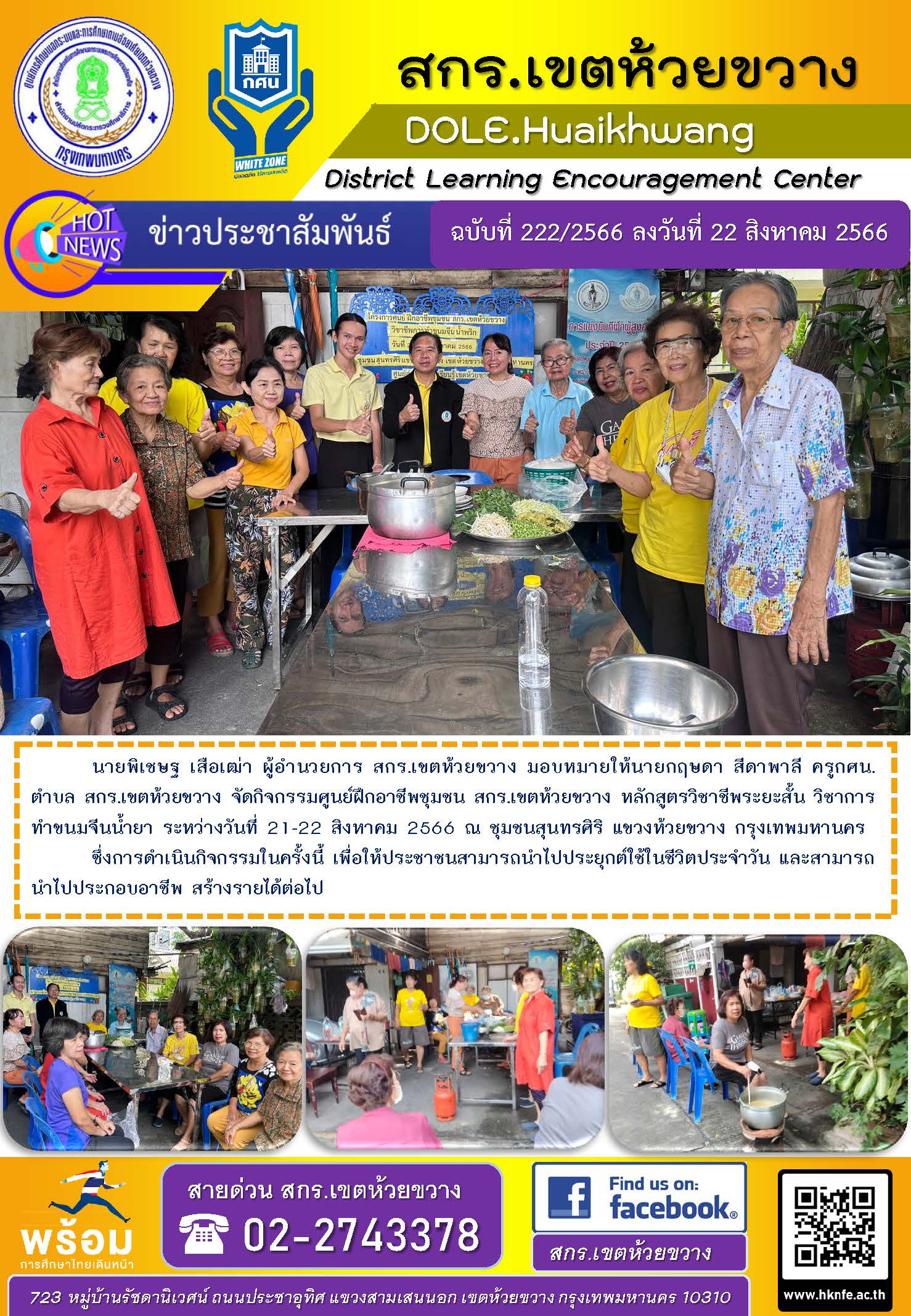 นายพิเชษฐ เสือเฒ่า ผู้อำนวยการ สกร.เขตห้วยขวาง มอบหมายให้นายกฤษดา สีดาพาลี ครูกศน.ตำบล สกร.เขตห้วยขวาง จัดกิจกรรมศูนย์ฝึกอาชีพชุมชน สกร.เขตห้วยขวาง หลักสูตรวิชาชีพระยะสั้น วิชาการทำขนมจีนน้ำยา ระหว่างวันที่ 21-22 สิงหาคม 2566 ณ ชุมชนสุนทรศิริ แขวงห้วยขวาง กรุงเทพมหานคร