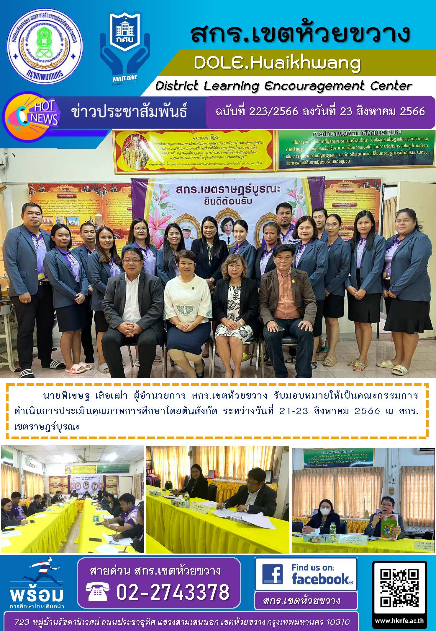 นายพิเชษฐ เสือเฒ่า ผู้อำนวยการ สกร.เขตห้วยขวาง รับมอบหมายให้เป็นคณะกรรมการดำเนินการประเมินคุณภาพการศึกษาโดยต้นสังกัด ระหว่างวันที่ 21-23 สิงหาคม 2566 ณ สกร.เขตราษฎร์บูรณะ