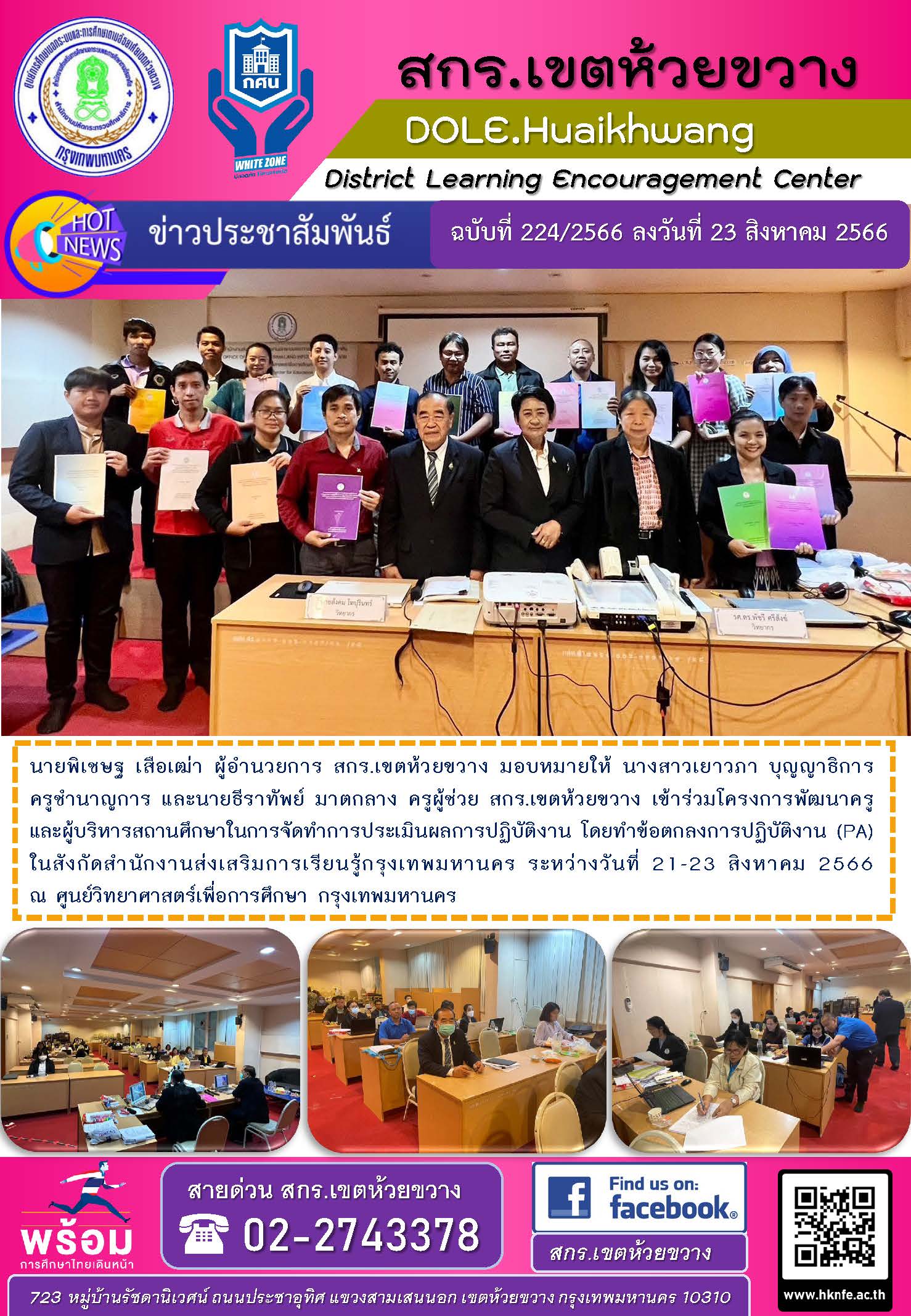 นายพิเชษฐ เสือเฒ่า ผู้อำนวยการ สกร.เขตห้วยขวาง มอบหมายให้ นางสาวเยาวภา บุญญาธิการ ครูชำนาญการ และนายธีราทัพย์ มาตกลาง ครูผู้ช่วย สกร.เขตห้วยขวาง เข้าร่วมโครงการพัฒนาครูและผู้บริหารสถานศึกษาในการจัดทำการประเมินผลการปฏิบัติงาน โดยทำข้อตกลงการปฏิบัติงาน (PA) ในสังกัดสำนักงานส่งเสริมการเรียนรู้กรุงเทพมหานคร ระหว่างวันที่ 21-23 สิงหาคม 2566 ณ ศูนย์วิทยาศาสตร์เพื่อการศึกษา กรุงเทพมหานคร