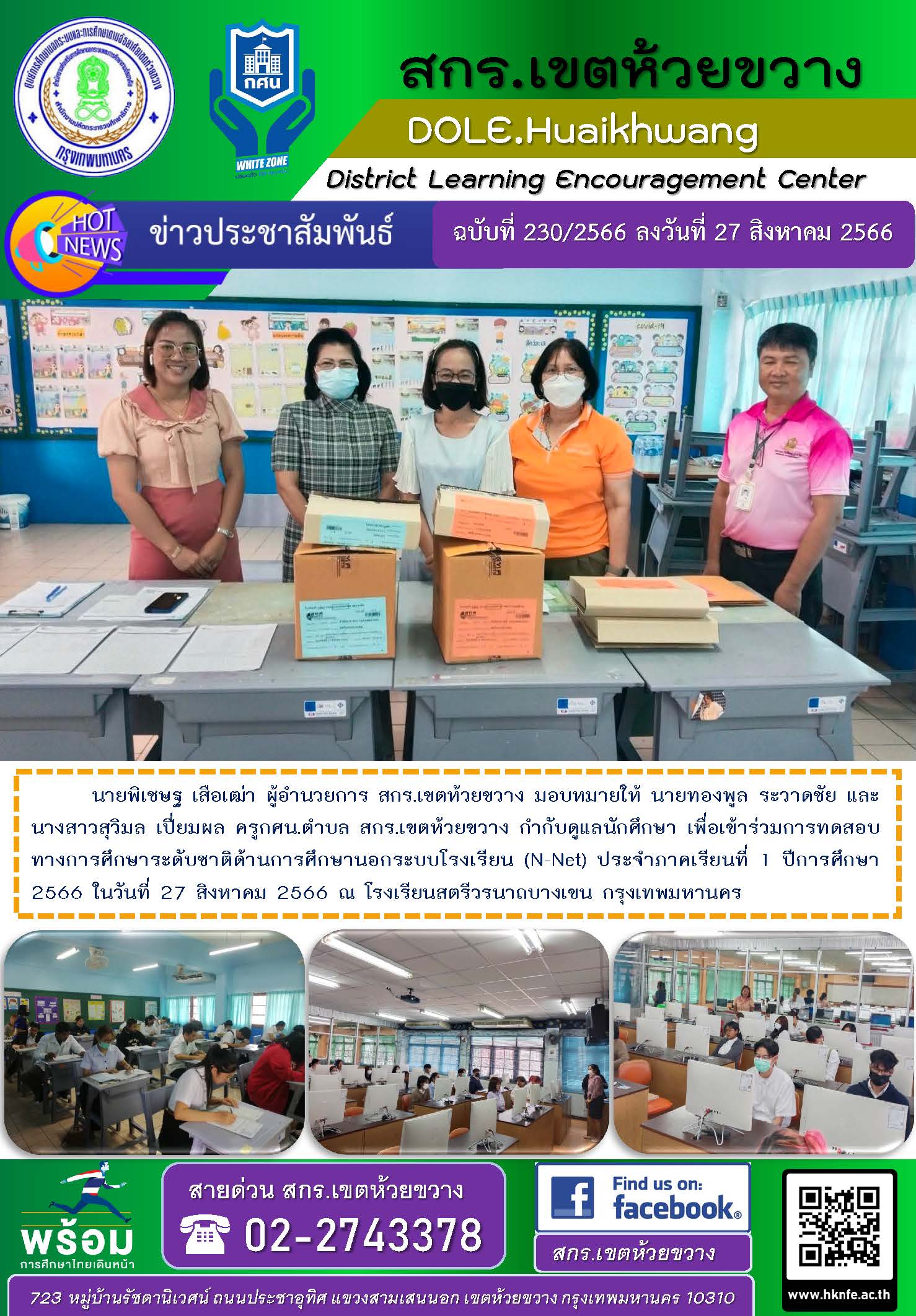 นายพิเชษฐ เสือเฒ่า ผู้อำนวยการ สกร.เขตห้วยขวาง มอบหมายให้ นายทองพูล ระวาดชัย และนางสาวสุวิมล เปี่ยมผล ครูกศน.ตำบล สกร.เขตห้วยขวาง กำกับดูแลนักศึกษา เพื่อเข้าร่วมการทดสอบทางการศึกษาระดับชาติด้านการศึกษานอกระบบโรงเรียน (N-Net) ประจำภาคเรียนที่ 1 ปีการศึกษา 2566 ในวันที่ 27 สิงหาคม 2566 ณ โรงเรียนสตรีวรนาถบางเขน กรุงเทพมหานคร