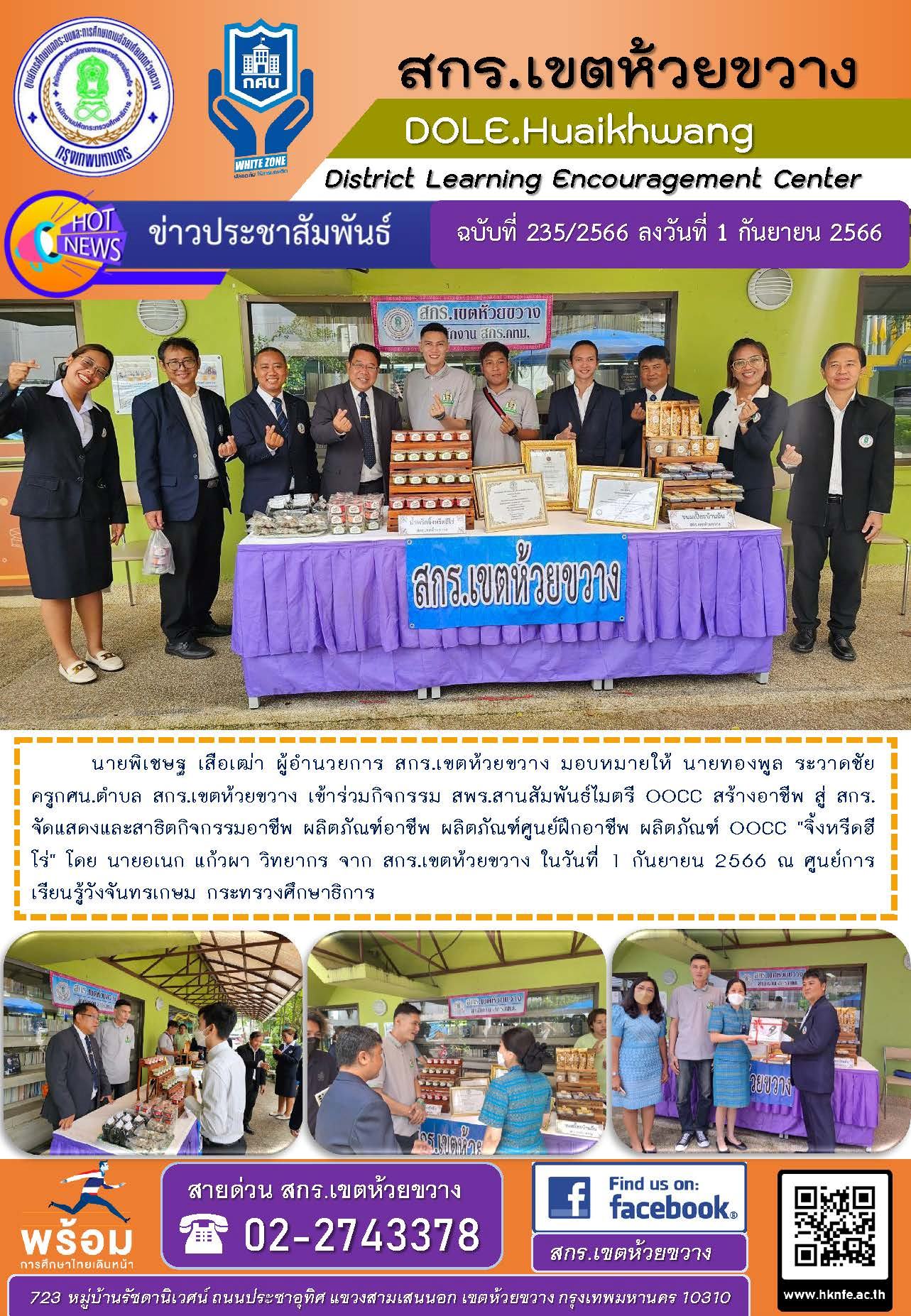 นายพิเชษฐ เสือเฒ่า ผู้อำนวยการ สกร.เขตห้วยขวาง มอบหมายให้ นายทองพูล ระวาดชัย ครูกศน.ตำบล สกร.เขตห้วยขวาง เข้าร่วมกิจกรรม สพร.สานสัมพันธ์ไมตรี OOCC สร้างอาชีพ สู่ สกร. จัดแสดงและสาธิตกิจกรรมอาชีพ ผลิตภัณฑ์อาชีพ ผลิตภัณฑ์ศูนย์ฝึกอาชีพ ผลิตภัณฑ์ OOCC "จิ้งหรีดฮีโร่" โดย นายอเนก แก้วผา วิทยากร จาก สกร.เขตห้วยขวาง ในวันที่ 1 กันยายน 2566 ณ ศูนย์การเรียนรู้วังจันทรเกษม กระทรวงศึกษาธิการ
