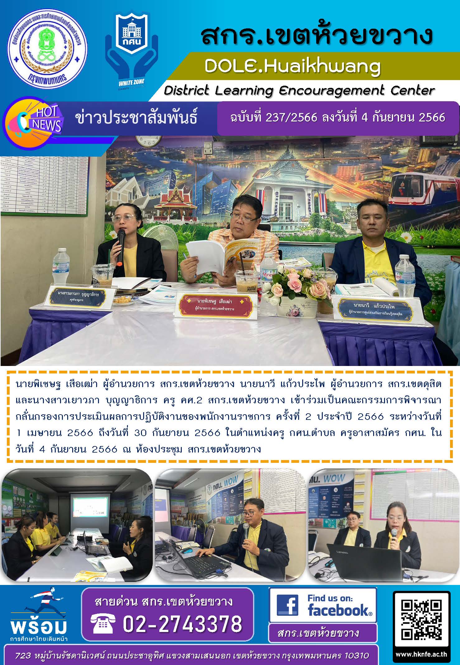 นายพิเชษฐ เสือเฒ่า ผู้อำนวยการ สกร.เขตห้วยขวาง นายนาวี แก้วประไพ ผู้อำนวยการ สกร.เขตดุสิต และนางสาวเยาวภา บุญญาธิการ ครู คศ.2 สกร.เขตห้วยขวาง เข้าร่วมเป็นคณะกรรมการพิจารณากลั่นกรองการประเมินผลการปฏิบัติงานของพนักงานราชการ ครั้งที่ 2 ประจำปี 2566 ระหว่างวันที่ 1 เมษายน 2566 ถึงวันที่ 30 กันยายน 2566 ในตำแหน่งครู กศน.ตำบล ครูอาสาสมัคร กศน. ในวันที่ 4 กันยายน 2566 ณ ห้องประชุม สกร.เขตห้วยขวาง