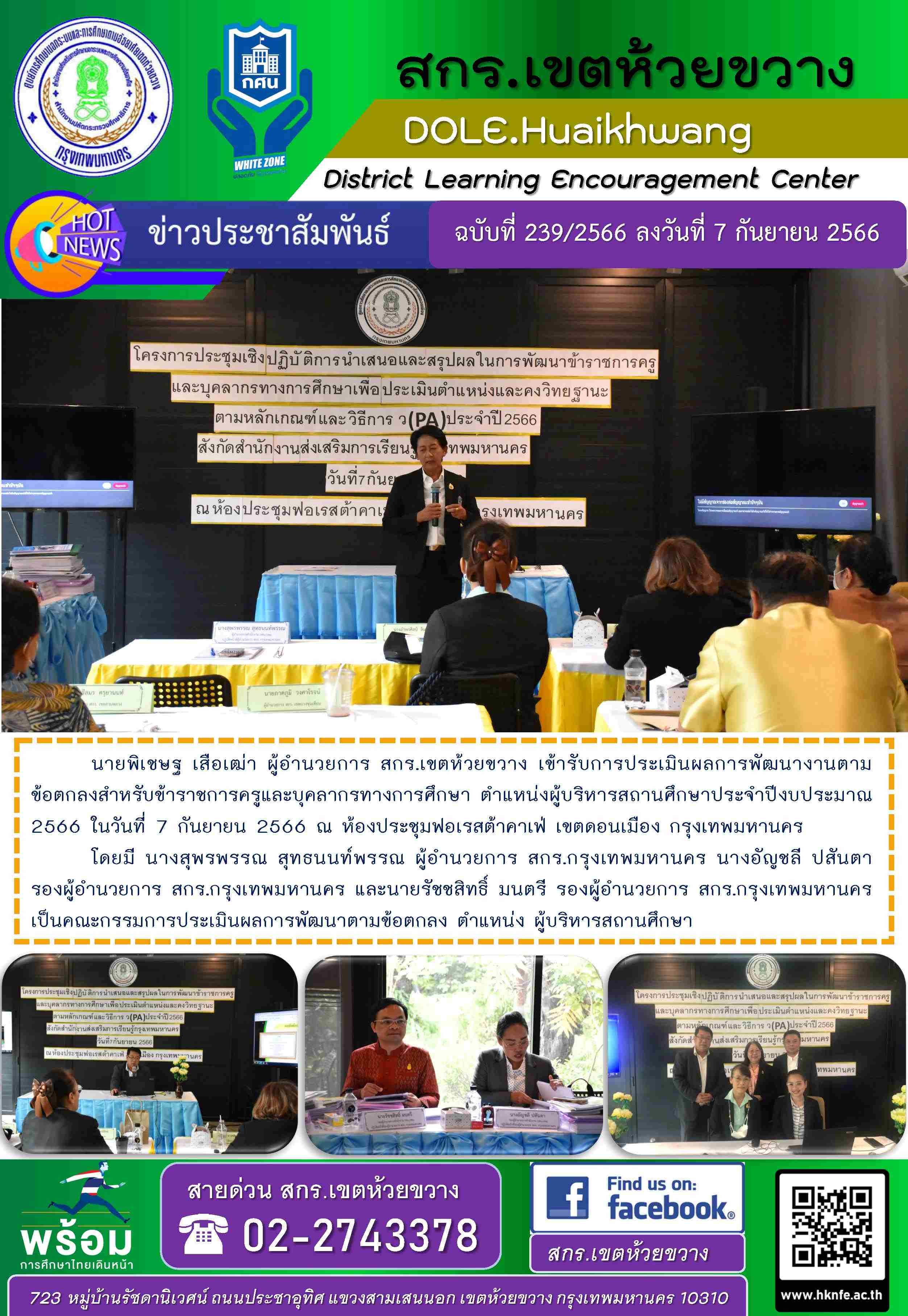 นายพิเชษฐ เสือเฒ่า ผู้อำนวยการ สกร.เขตห้วยขวาง เข้ารับการประเมินผลการพัฒนางานตามข้อตกลงสำหรับข้าราชการครูและบุคลากรทางการศึกษา ตำแหน่งผู้บริหารสถานศึกษาประจำปีงบประมาณ 2566 ในวันที่ 7 กันยายน 2566 ณ ห้องประชุมฟอเรสต้าคาเฟ่ เขตดอนเมือง กรุงเทพมหานคร