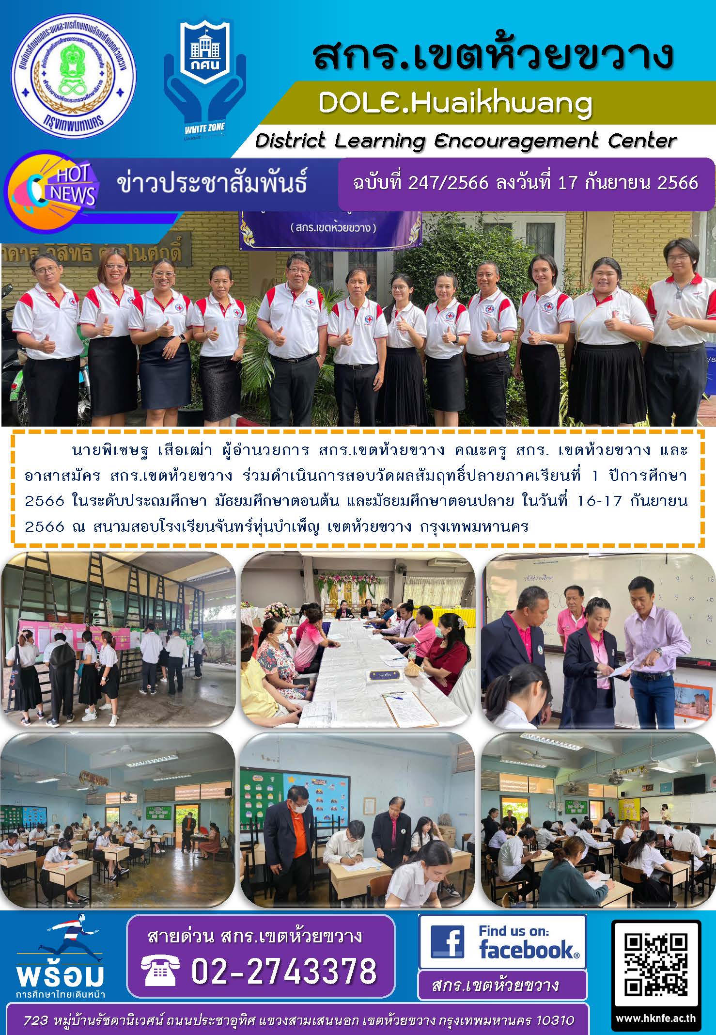 นายพิเชษฐ เสือเฒ่า ผู้อำนวยการ สกร.เขตห้วยขวาง คณะครู สกร. เขตห้วยขวาง และอาสาสมัคร สกร.เขตห้วยขวาง ร่วมดำเนินการสอบวัดผลสัมฤทธิ์ปลายภาคเรียนที่ 1 ปีการศึกษา 2566 ในระดับประถมศึกษา มัธยมศึกษาตอนต้น และมัธยมศึกษาตอนปลาย ในวันที่ 16-17 กันยายน 2566 ณ สนามสอบโรงเรียนจันทร์หุ่นบำเพ็ญ เขตห้วยขวาง กรุงเทพมหานคร