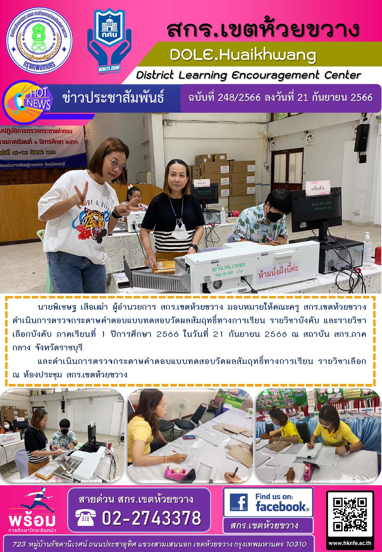 นายพิเชษฐ เสือเฒ่า ผู้อำนวยการ สกร.เขตห้วยขวาง มอบหมายให้คณะครู สกร.เขตห้วยขวาง ดำเนินการตรวจกระดาษคำตอบแบบทดสอบวัดผลสัมฤทธิ์ทางการเรียน รายวิชาบังคับ และรายวิชาเลือกบังคับ ภาคเรียนที่ 1 ปีการศึกษา 2566 ในวันที่ 21 กันยายน 2566 ณ สถาบัน สกร.ภาคกลาง จังหวัดราชบุรี